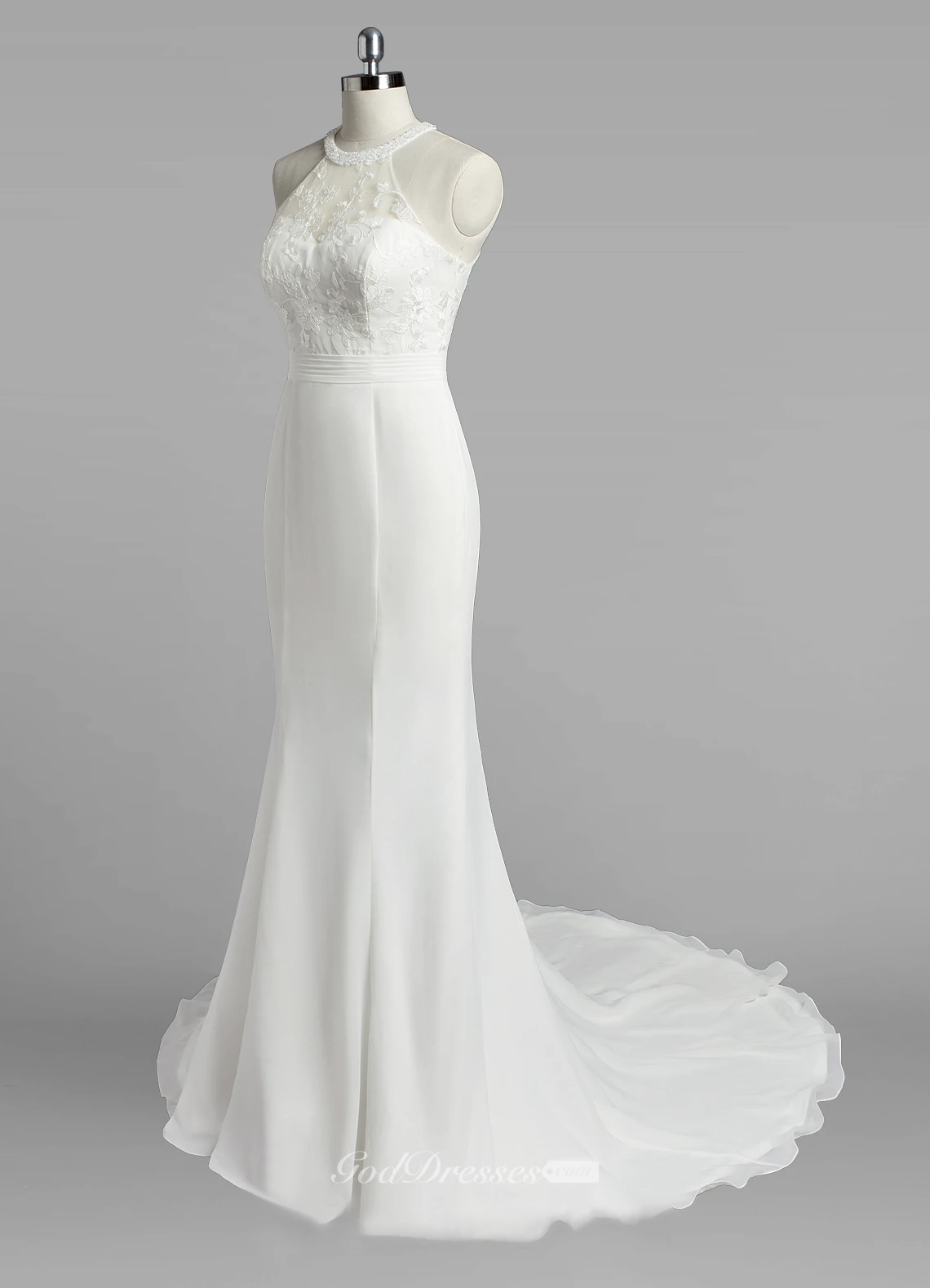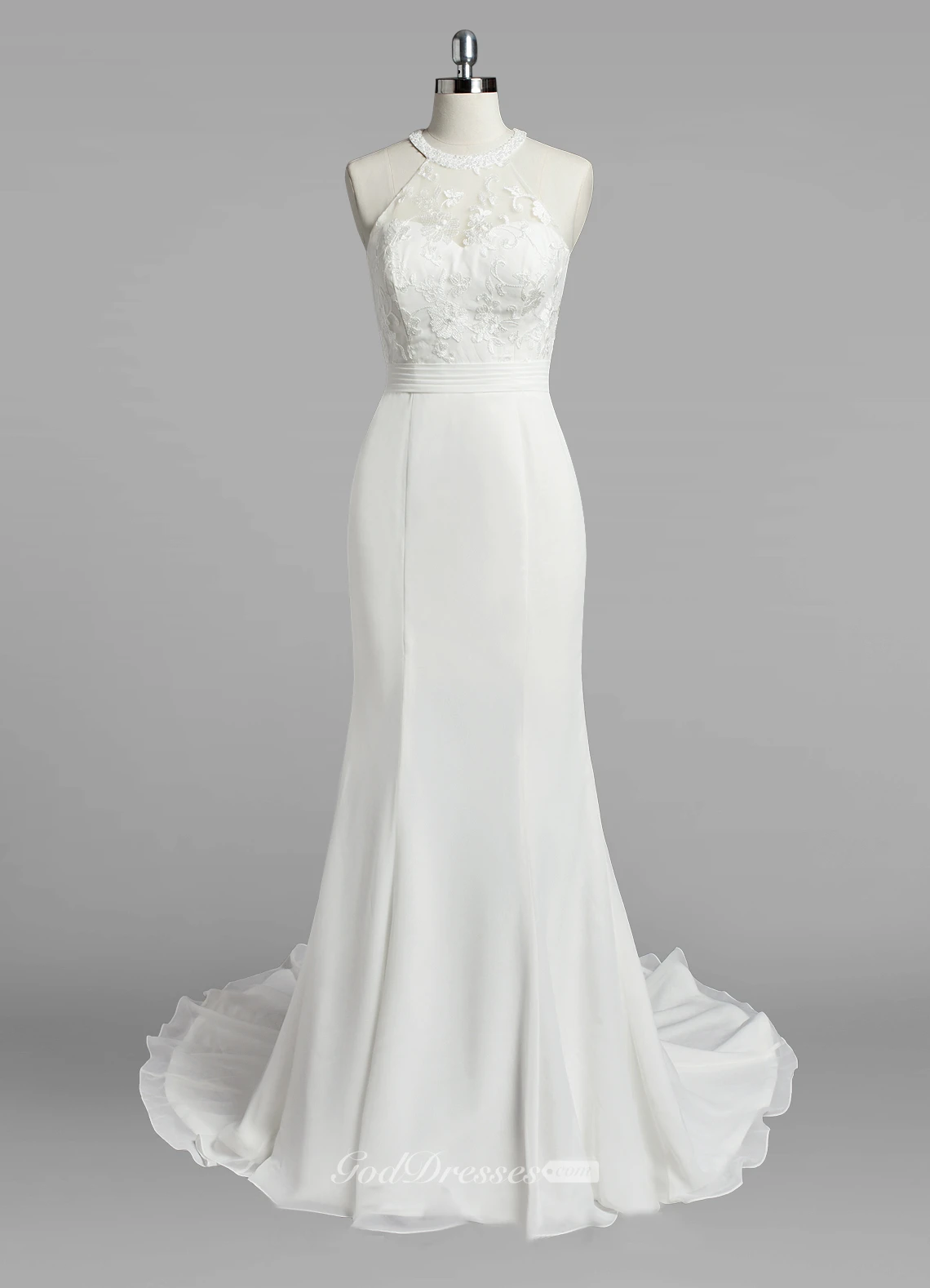 Jewel Neck Mermaid Chiffon Wedding Dress With Lace Bodice