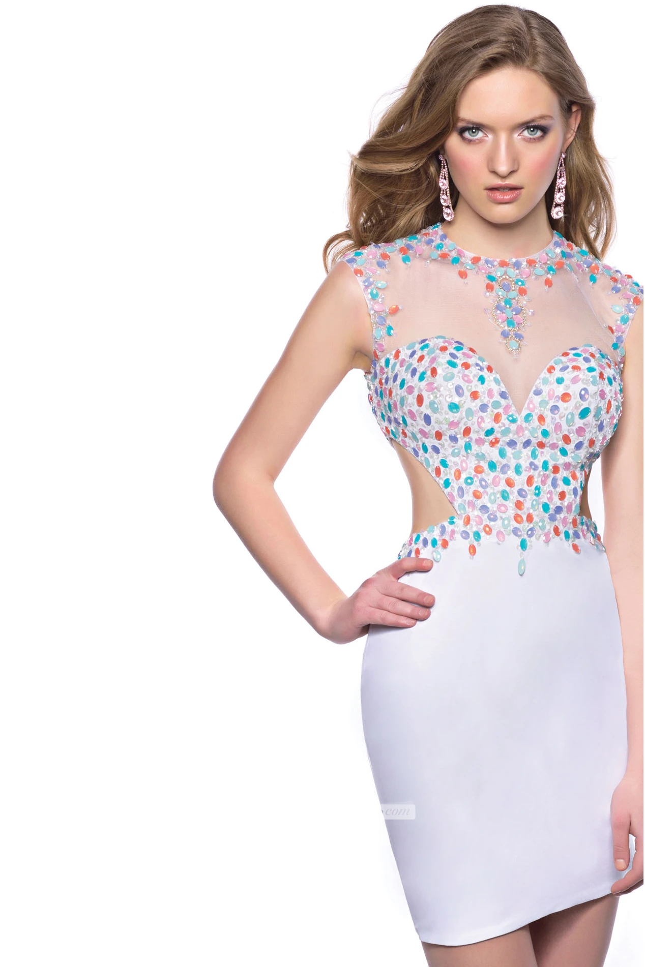 Jewel Neck Short Sheath Sleeveless Homecoming Dress With Rhinestone Embellishment