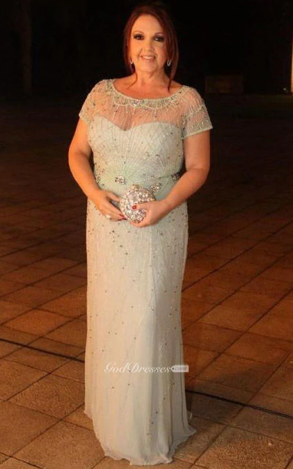 Jewel Neck Short Sleeve Sheath Chiffon Long Dress With Beadings