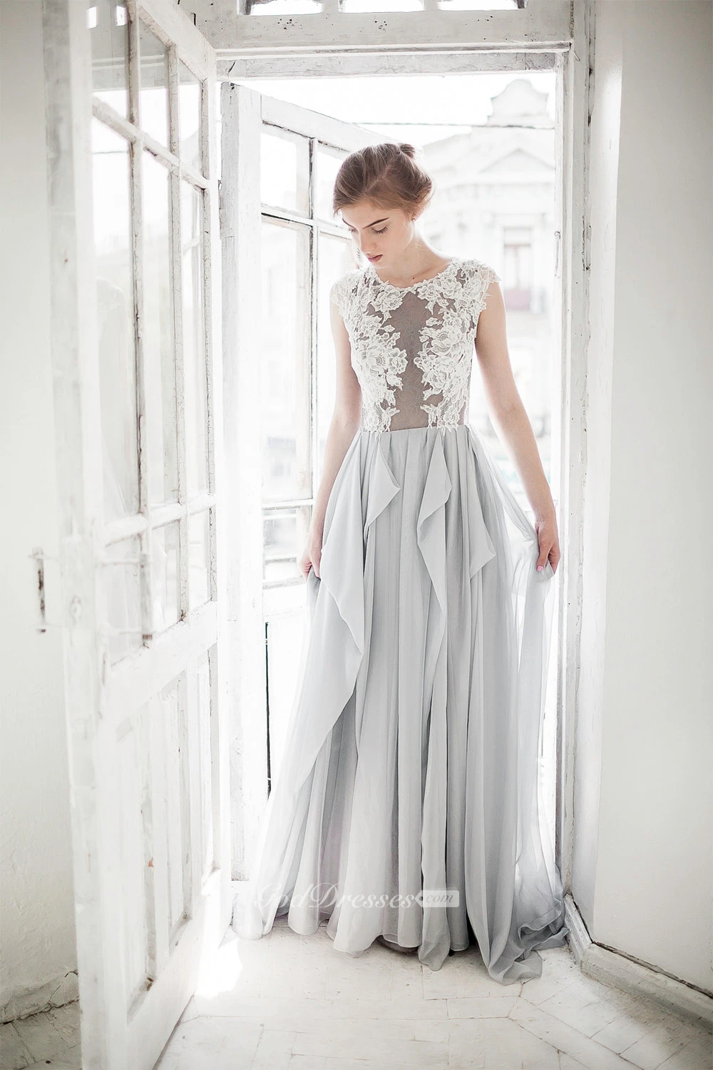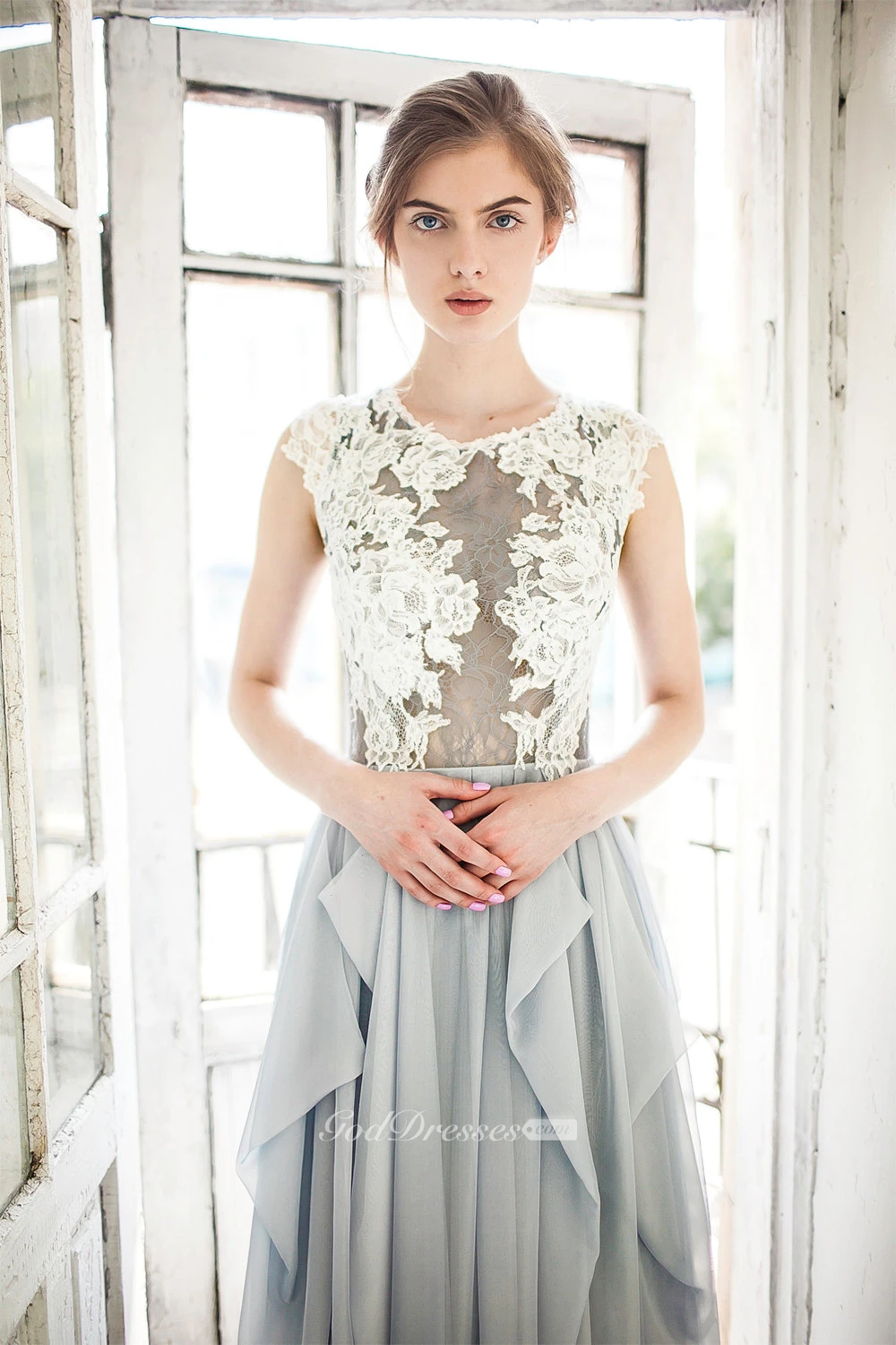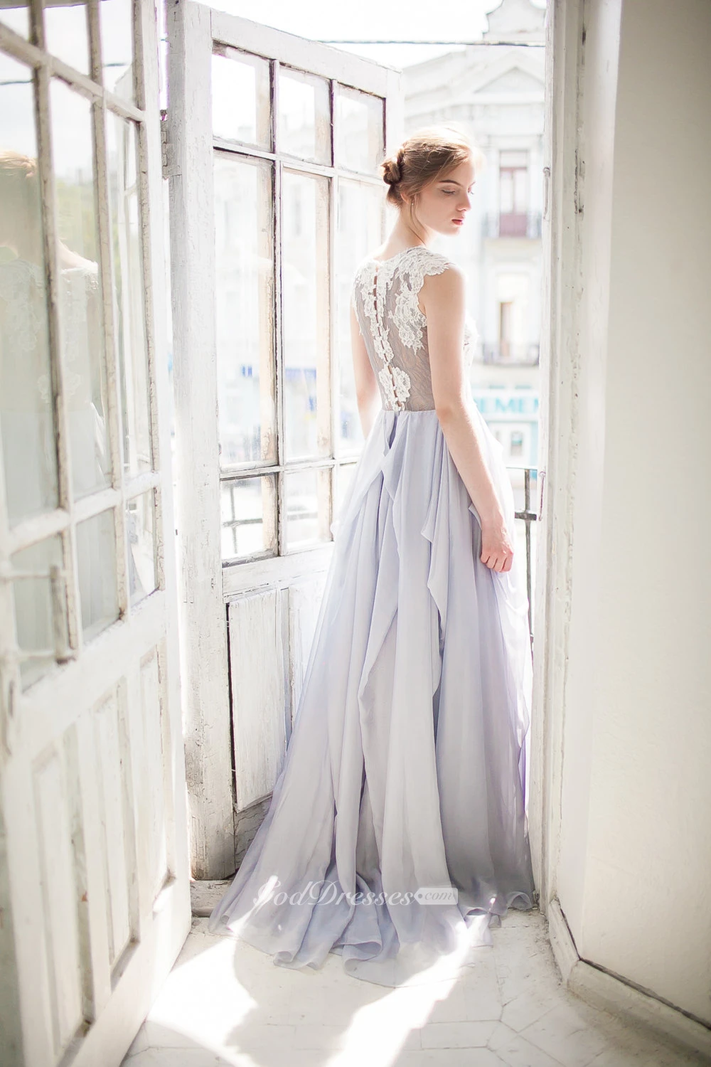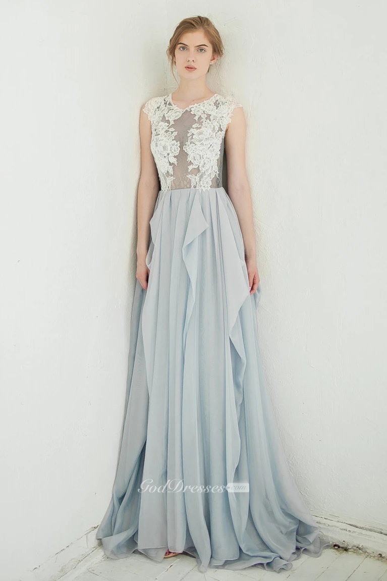 Jewel-Neck Sleeveless A-Line Chiffon Draped Dress With Lace Appliqued Top