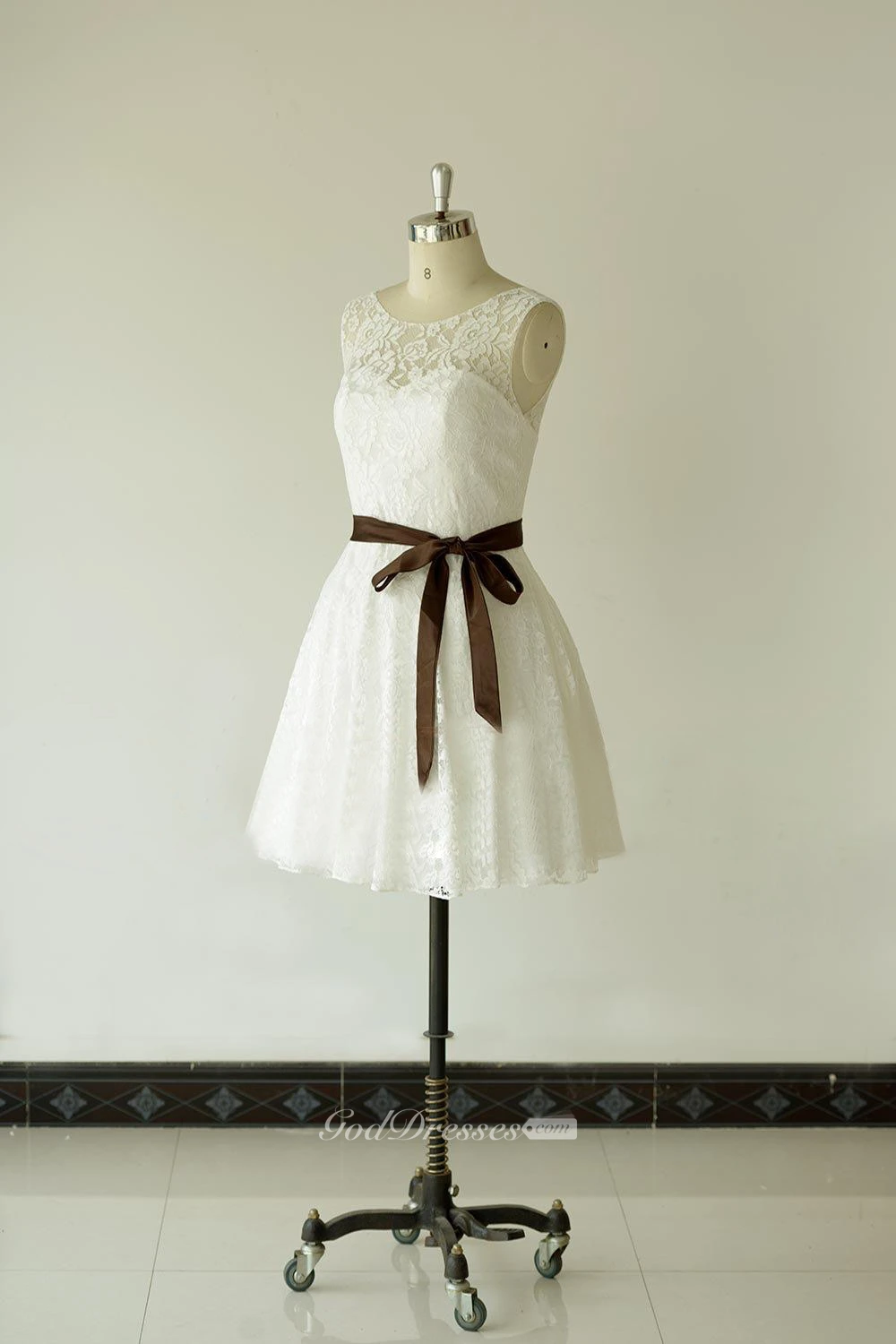 Jewel Neck Sleeveless A-Line Lace Short Dress With Chocolate Bow Sash