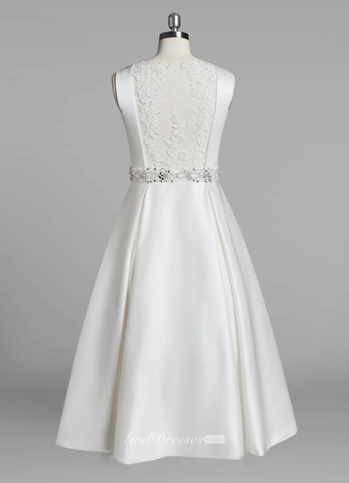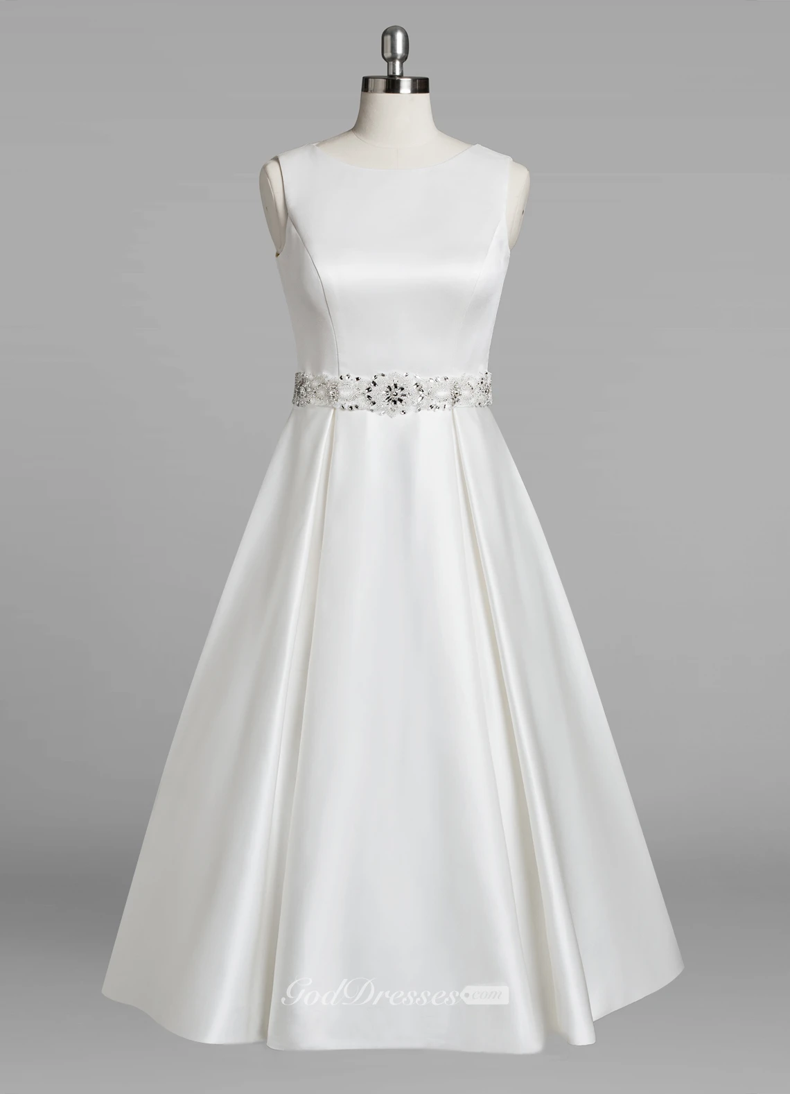 Jewel Neck Sleeveless A-Line Tea-Length Satin Wedding Dress With Beading
