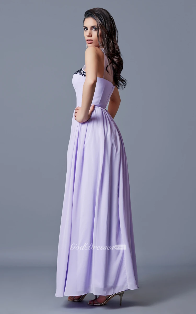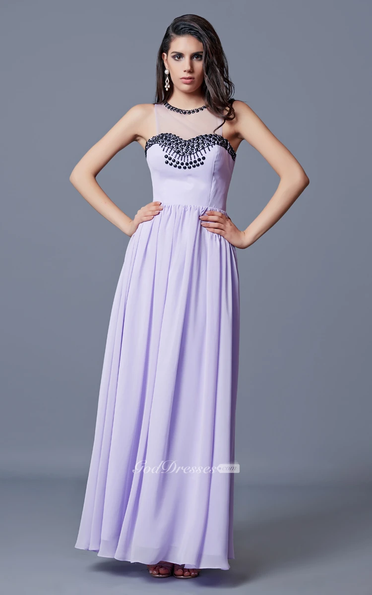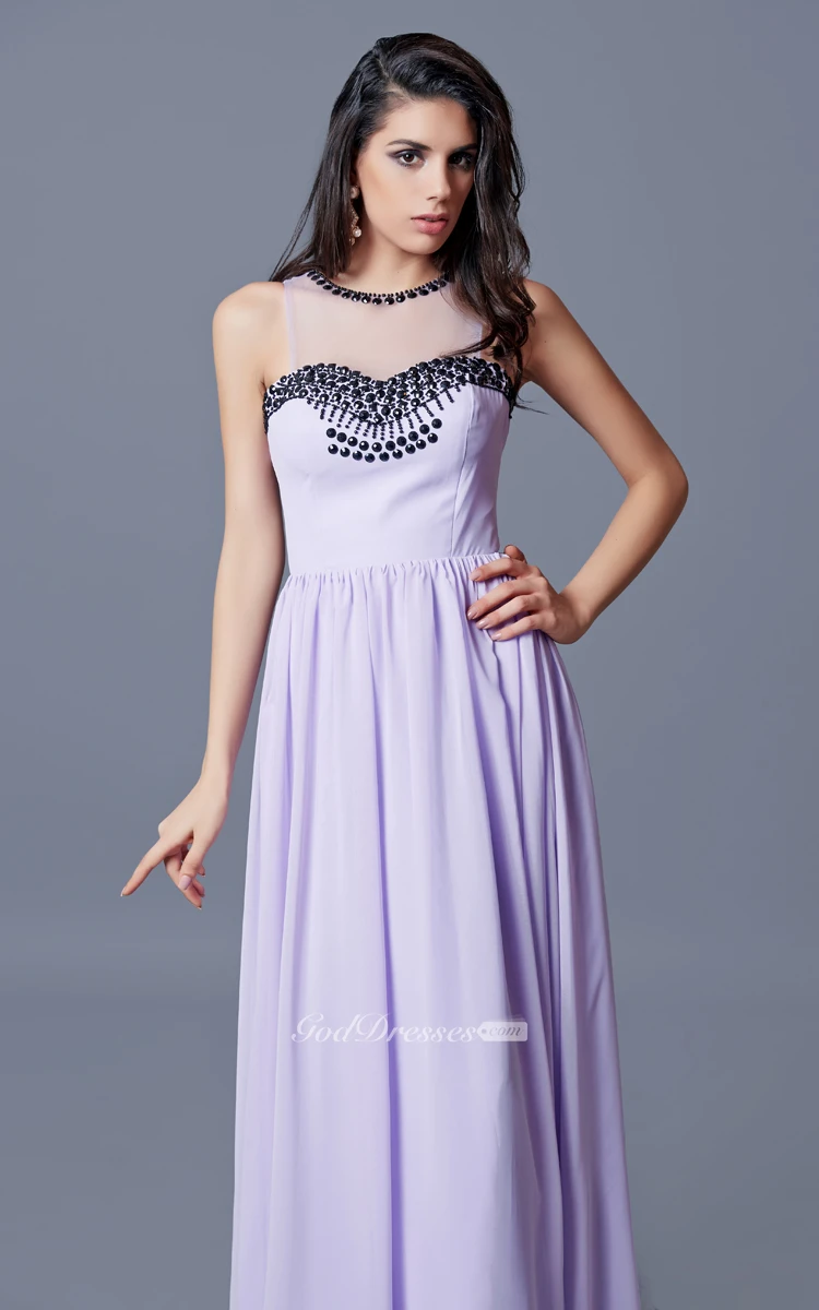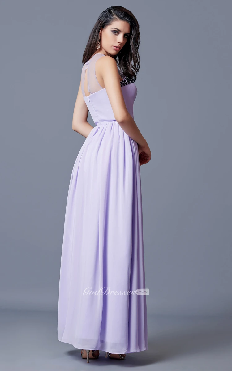 Jewel Neckline Pleated A-line Long Chiffon Dress