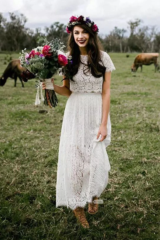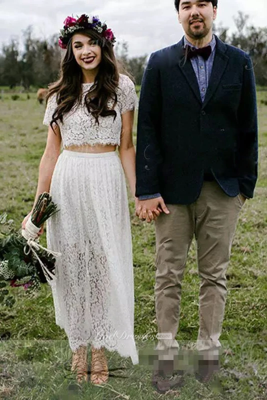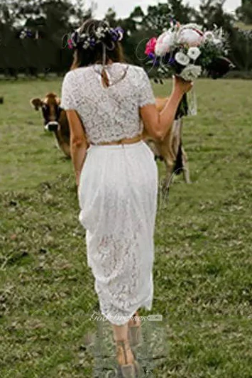 Jewel T-shirt Short Sleeve Ankle-length Lace A-Line Sheath Wedding Dress