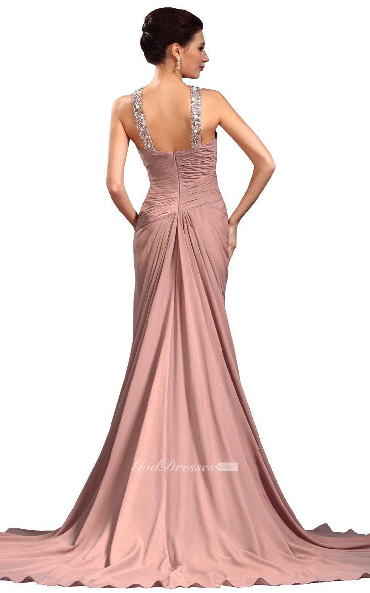 Jeweled-neck Front Slit Ruched Chiffon Gown