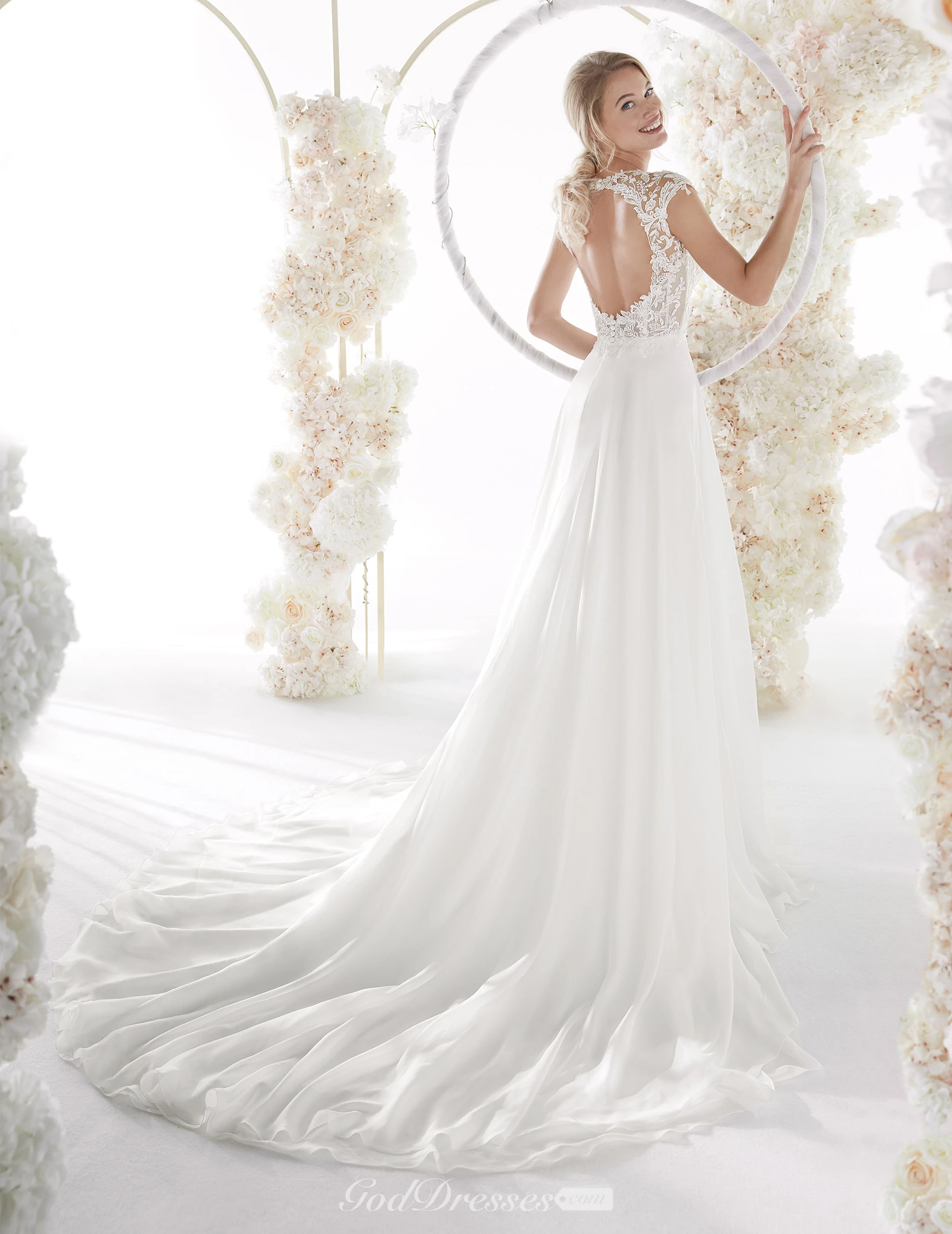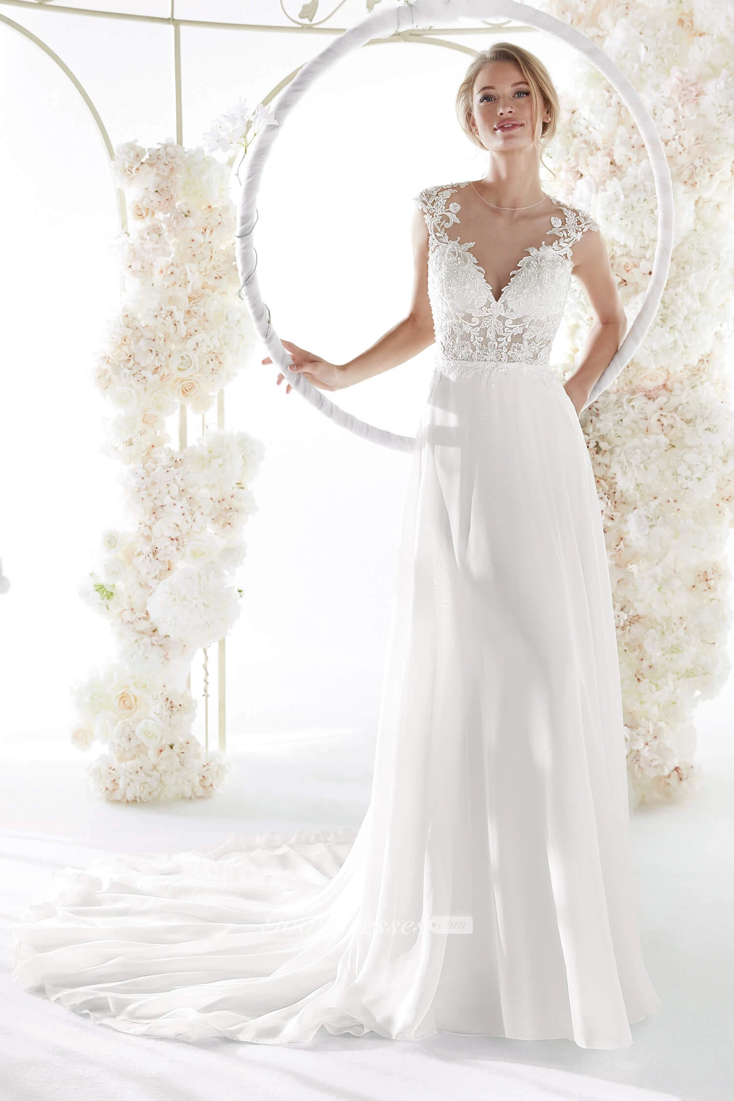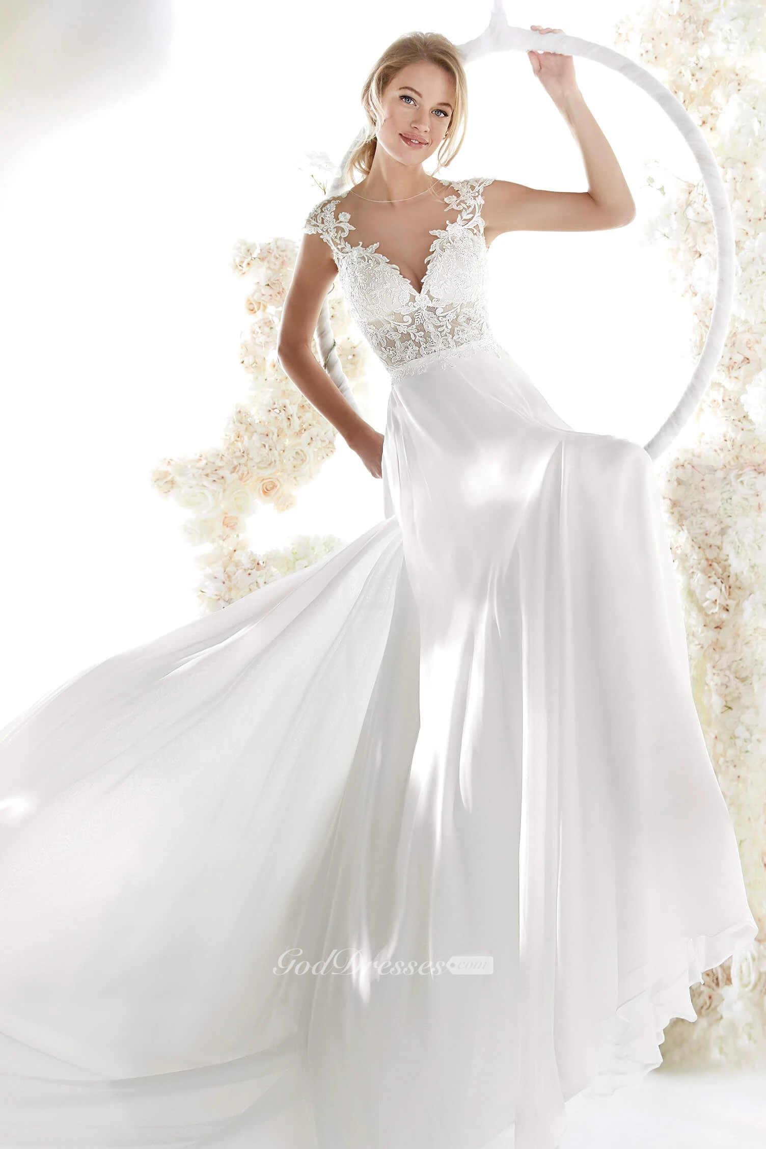 Keyhole Back Cap Sleeve Elegant Illusion Lace Chiffon Wedding Gown With Plunging Neckline