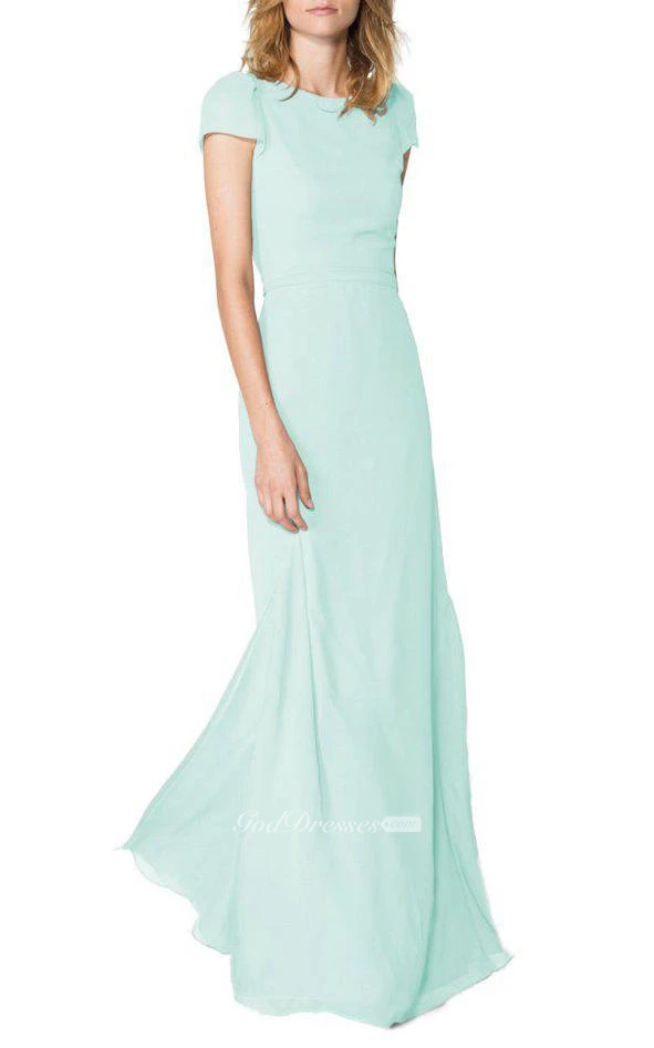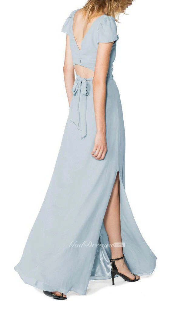 Keyhole Back Short Sleeves Long Chiffon Dress with Side Split