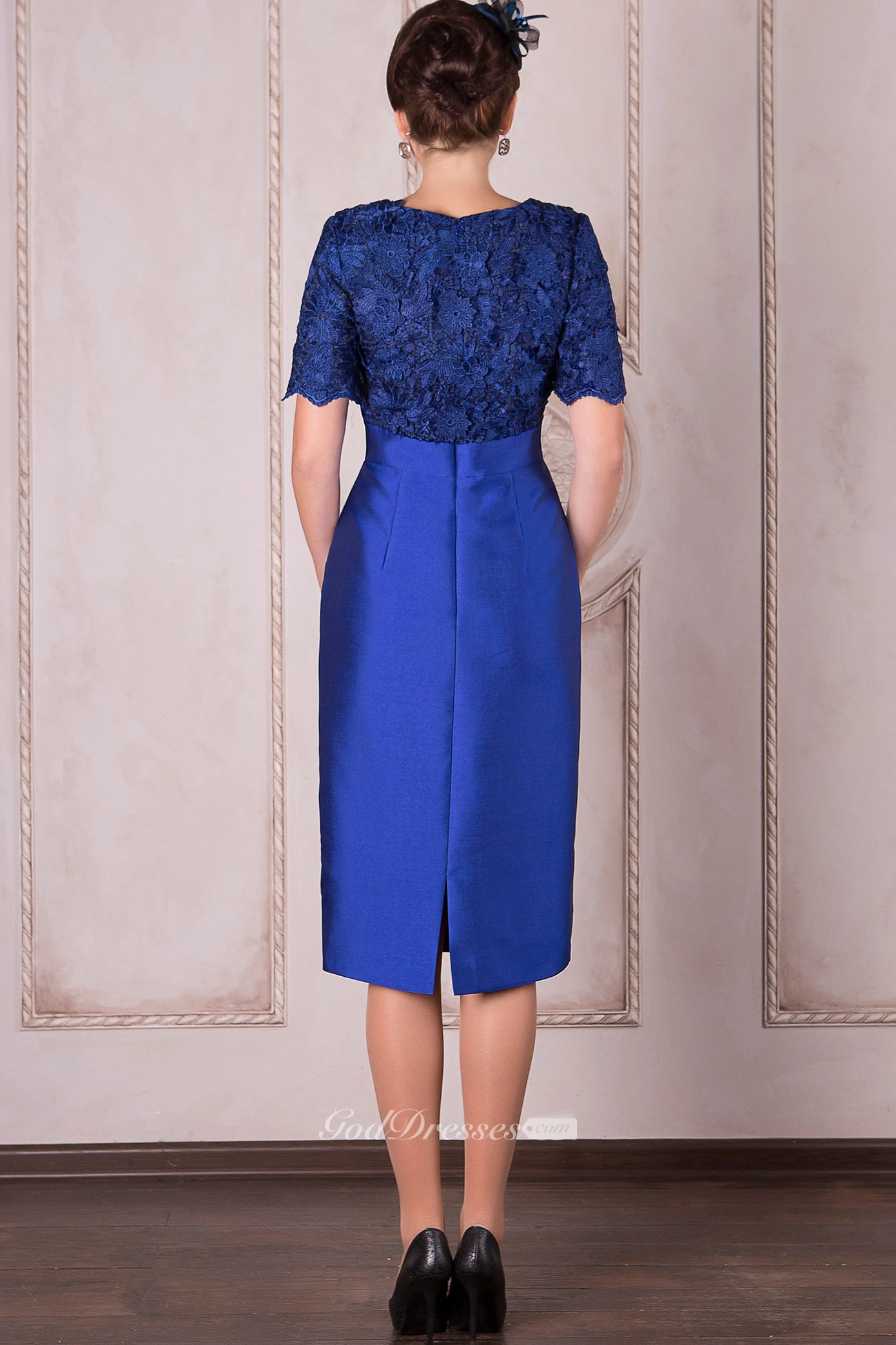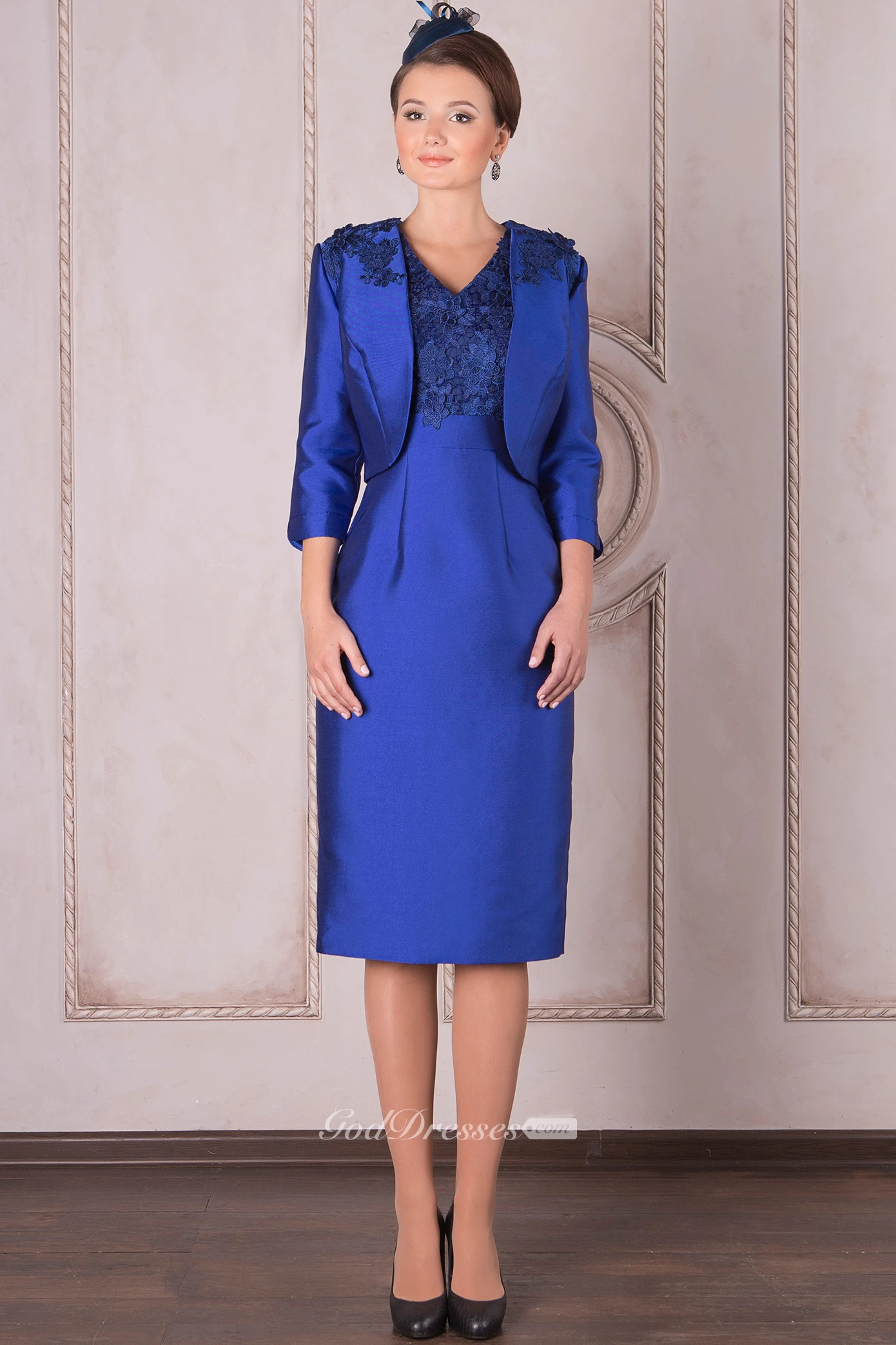 Knee-Length 3-4 Sleeve V-Neck Appliqued Satin Mother Of The Bride Dress