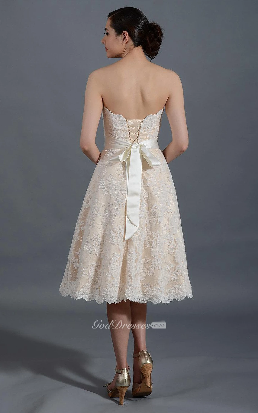 Knee Length A-Line Lace Gown With Lace-Up Back and Back Bow