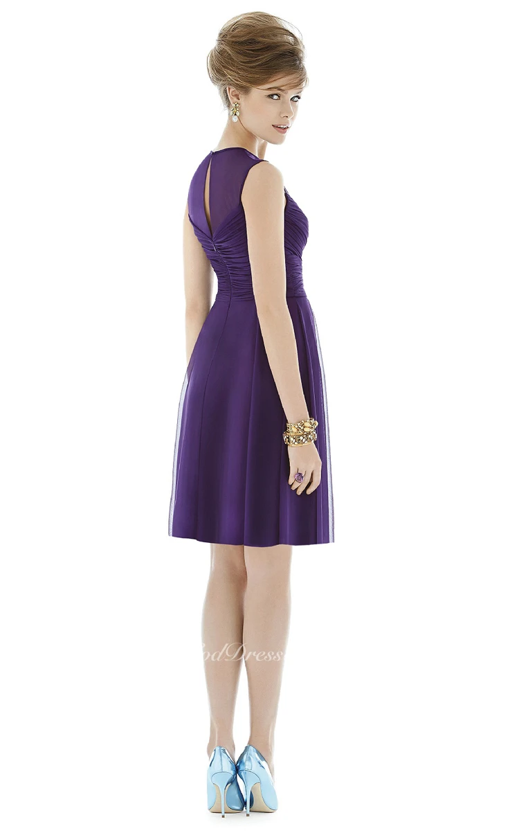 Knee-Length Criss Cross Ruched Sleeveless Illusion Chiffon Dress