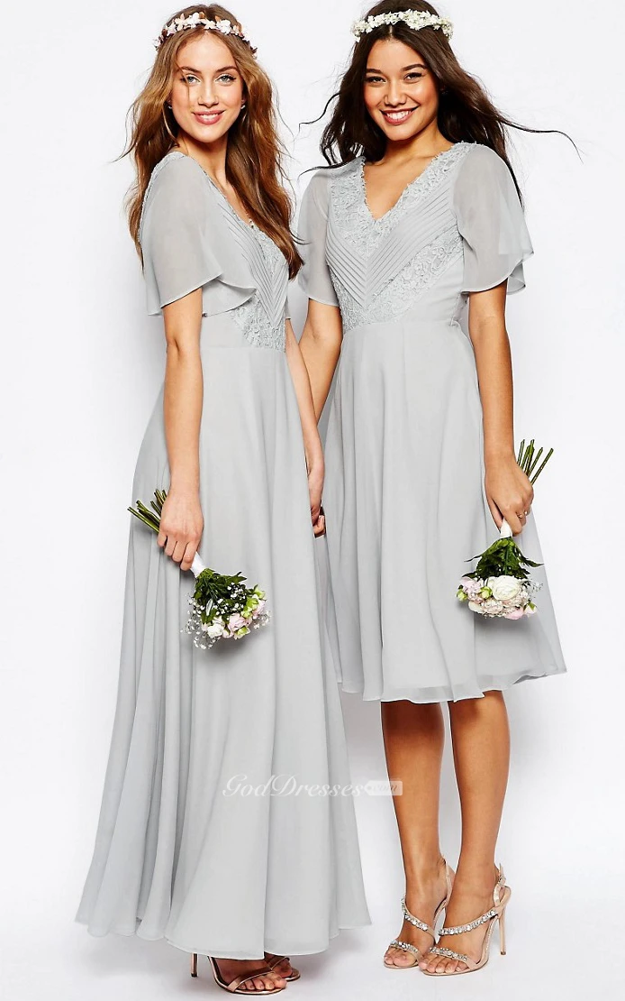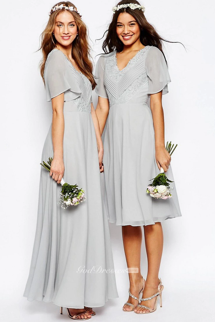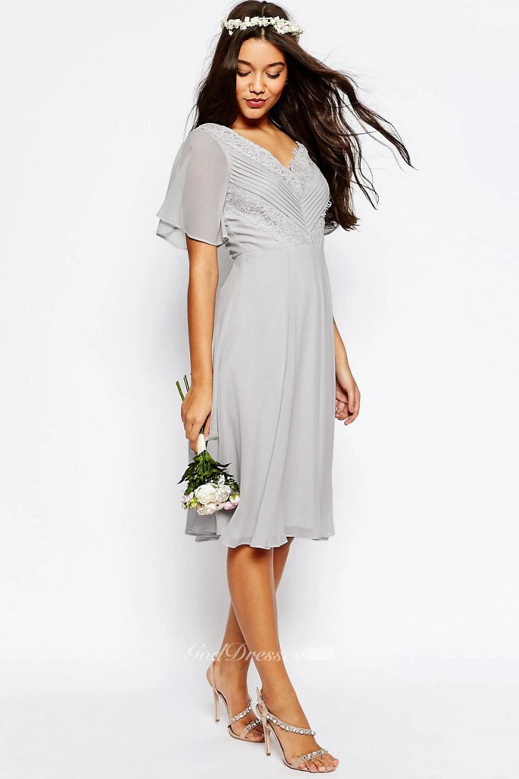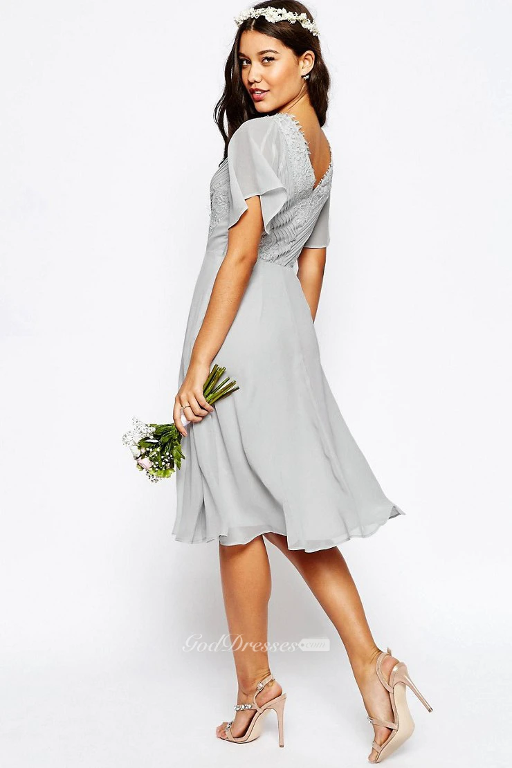 Knee-Length Lace Poet Sleeve V-Neck Chiffon Bridesmaid Dress With Ruching