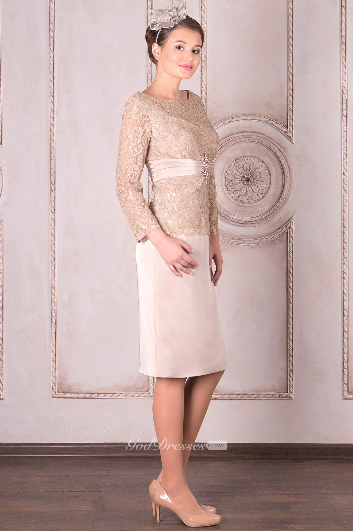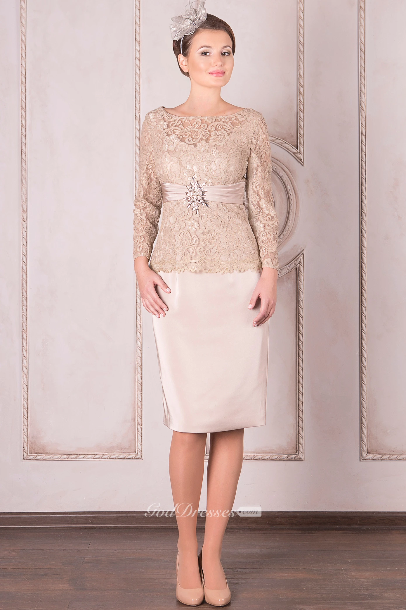 Knee-Length Pencil Appliqued Bateau Neck Long Sleeve Satin Mother Of The Bride Dress