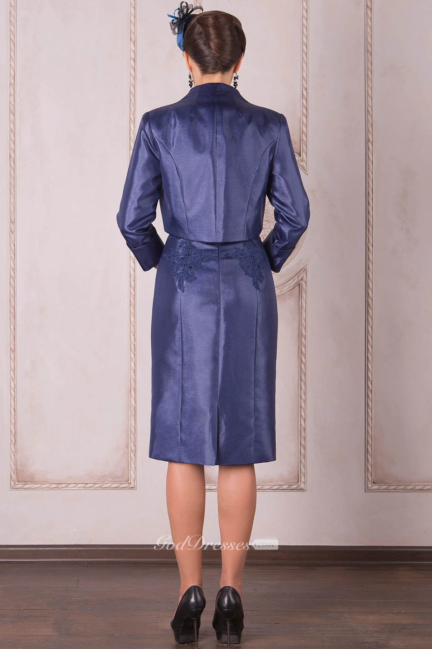 Knee-Length Pencil Appliqued High Neck Long Sleeve Satin Mother Of The Bride Dress