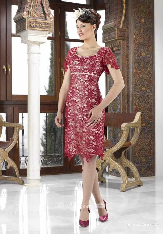 Knee-Length Short Sleeve Square Neck Beaded Lace Mother Of The Bride Dress With Bow