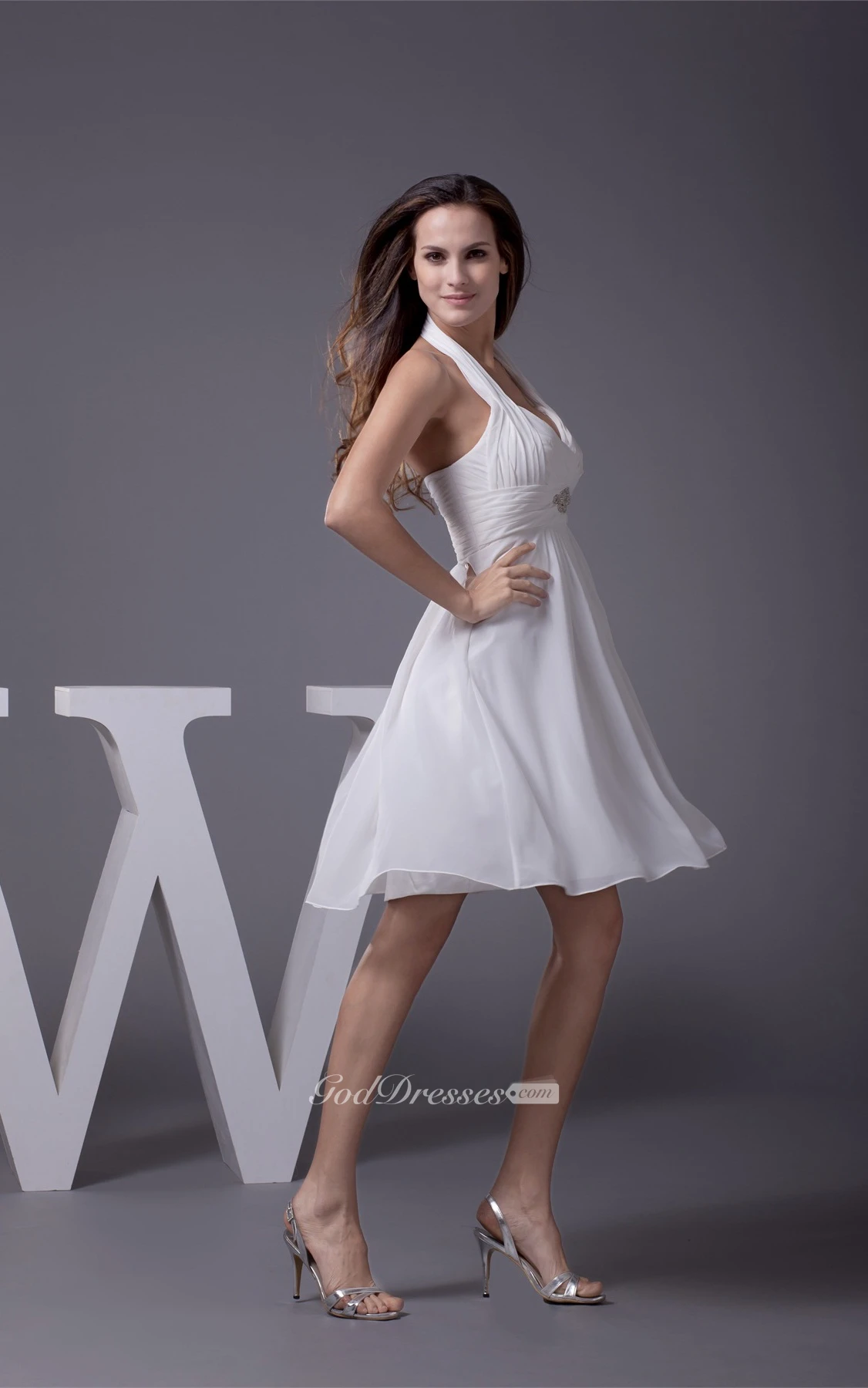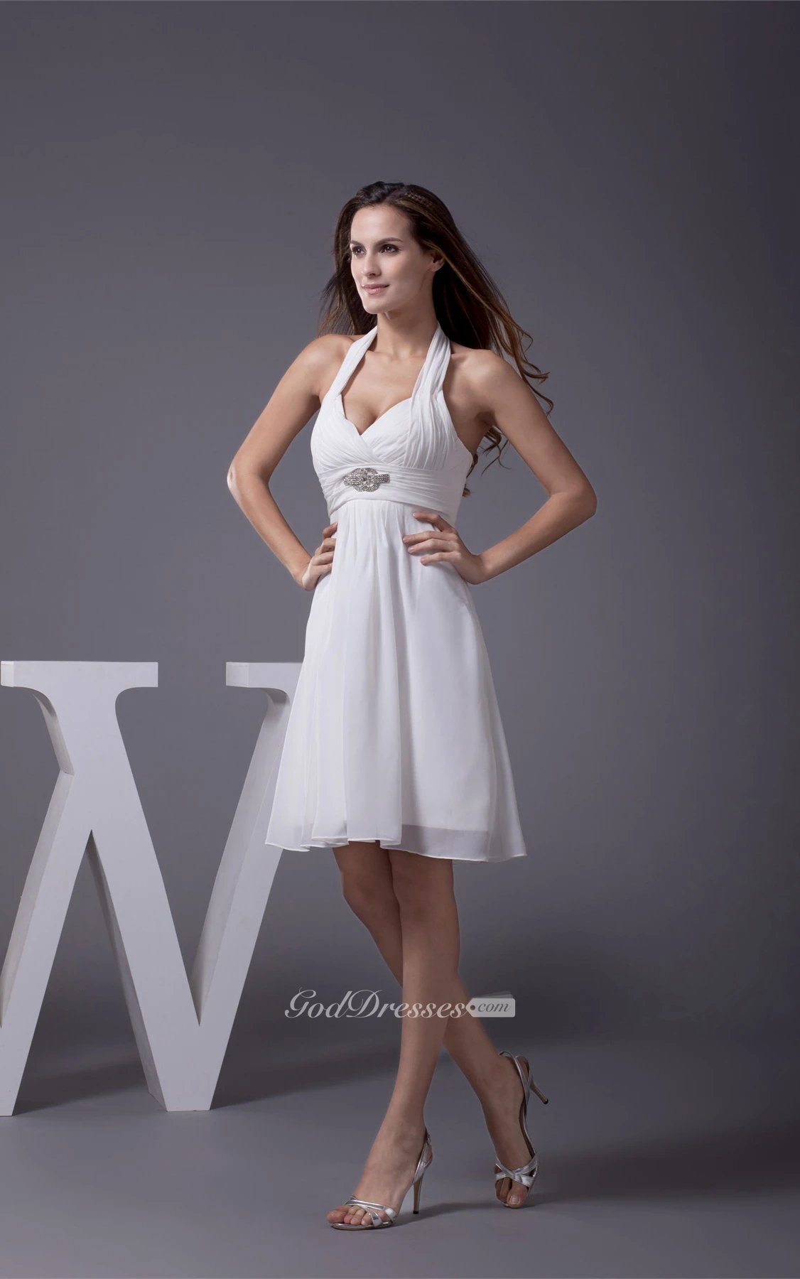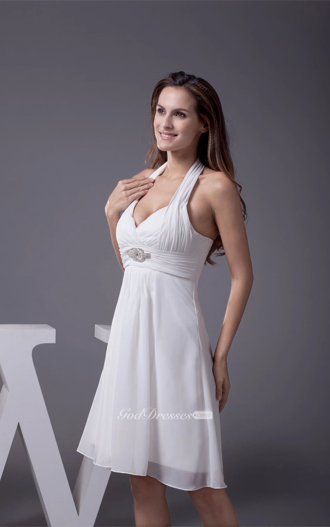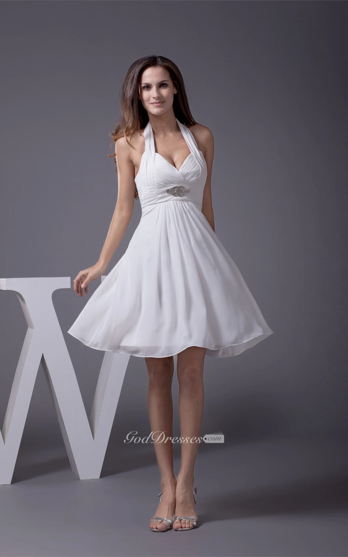Knee Length Sleeveless Halter A-Line Dress With Ruching and Beadings