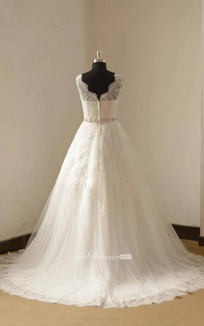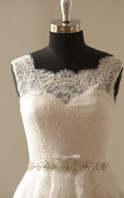 Lace A-Line Sleeveless Gown With Scalloped Bateau Neck and Beaded Waist