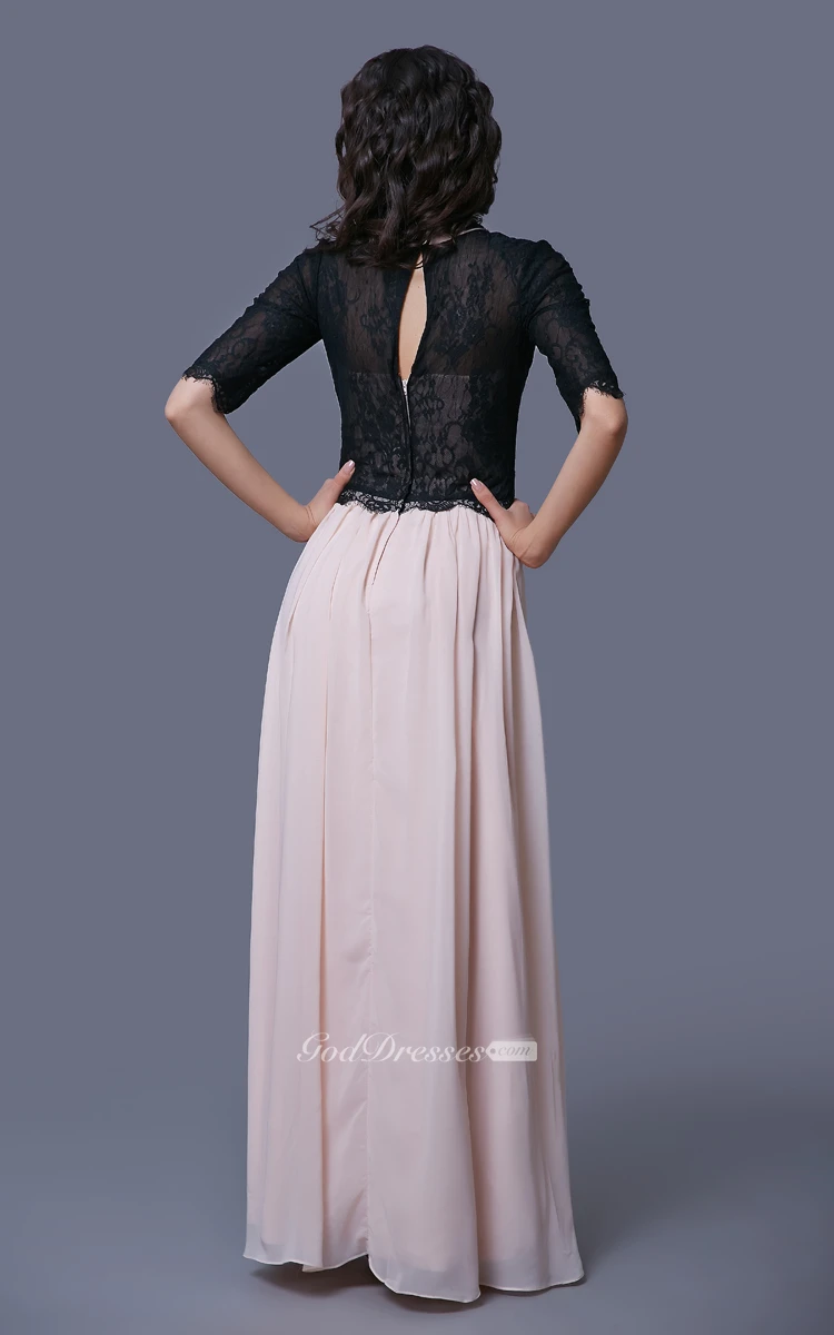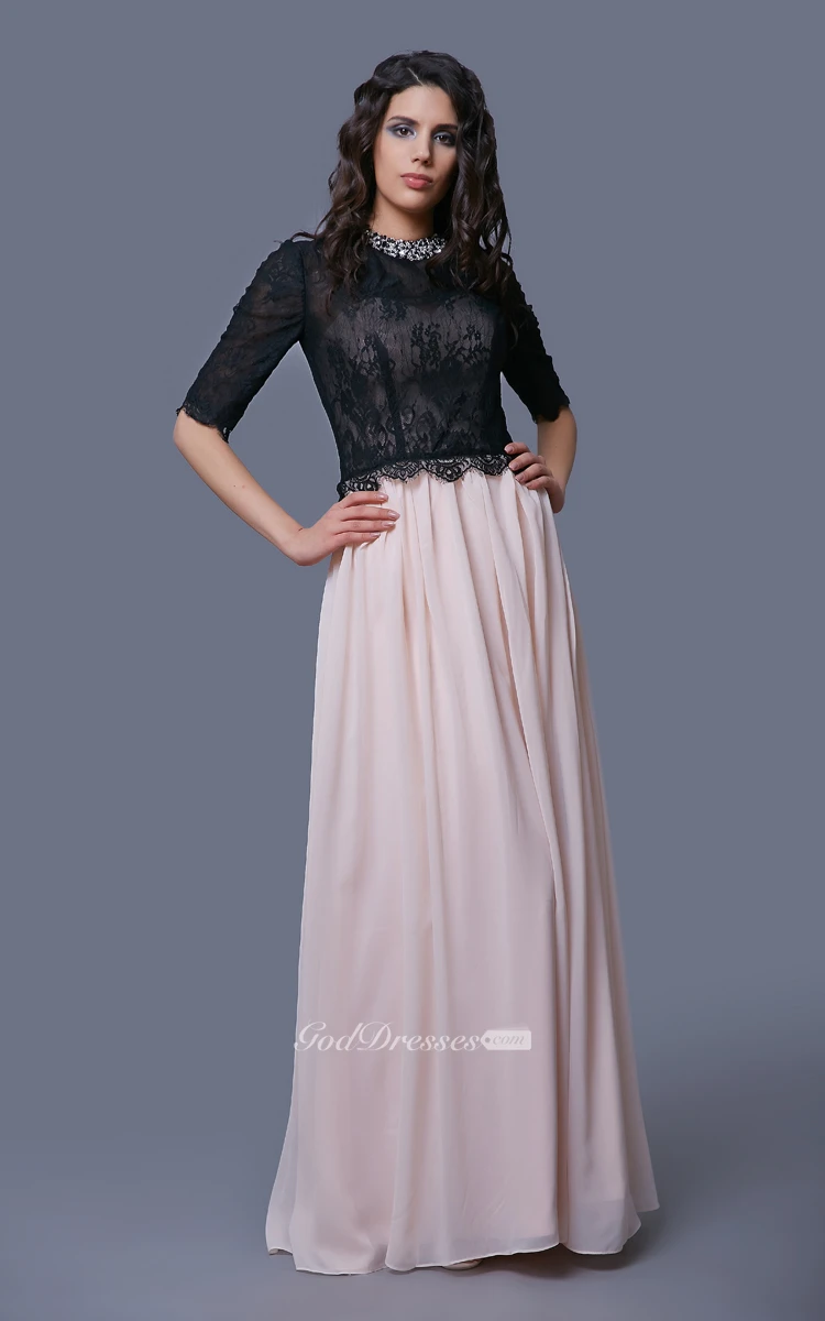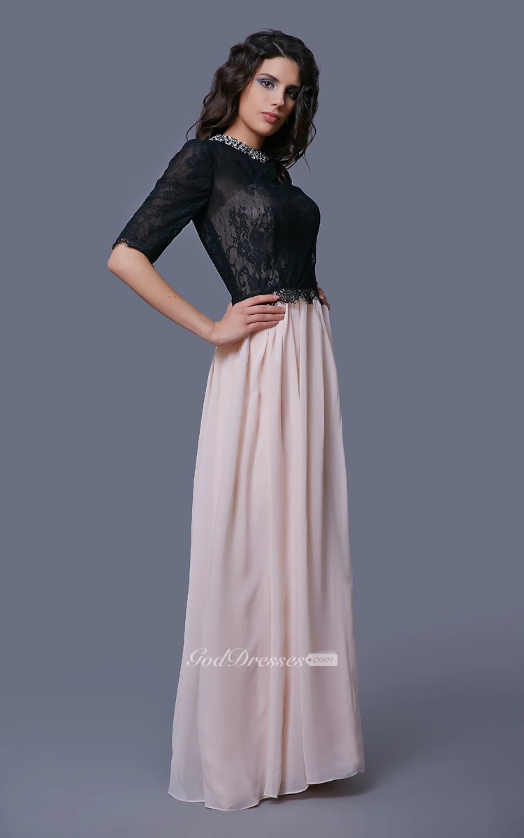Lace and Chiffon A-Line Floor Length Dress With Half Sleeves and Jeweled Neck