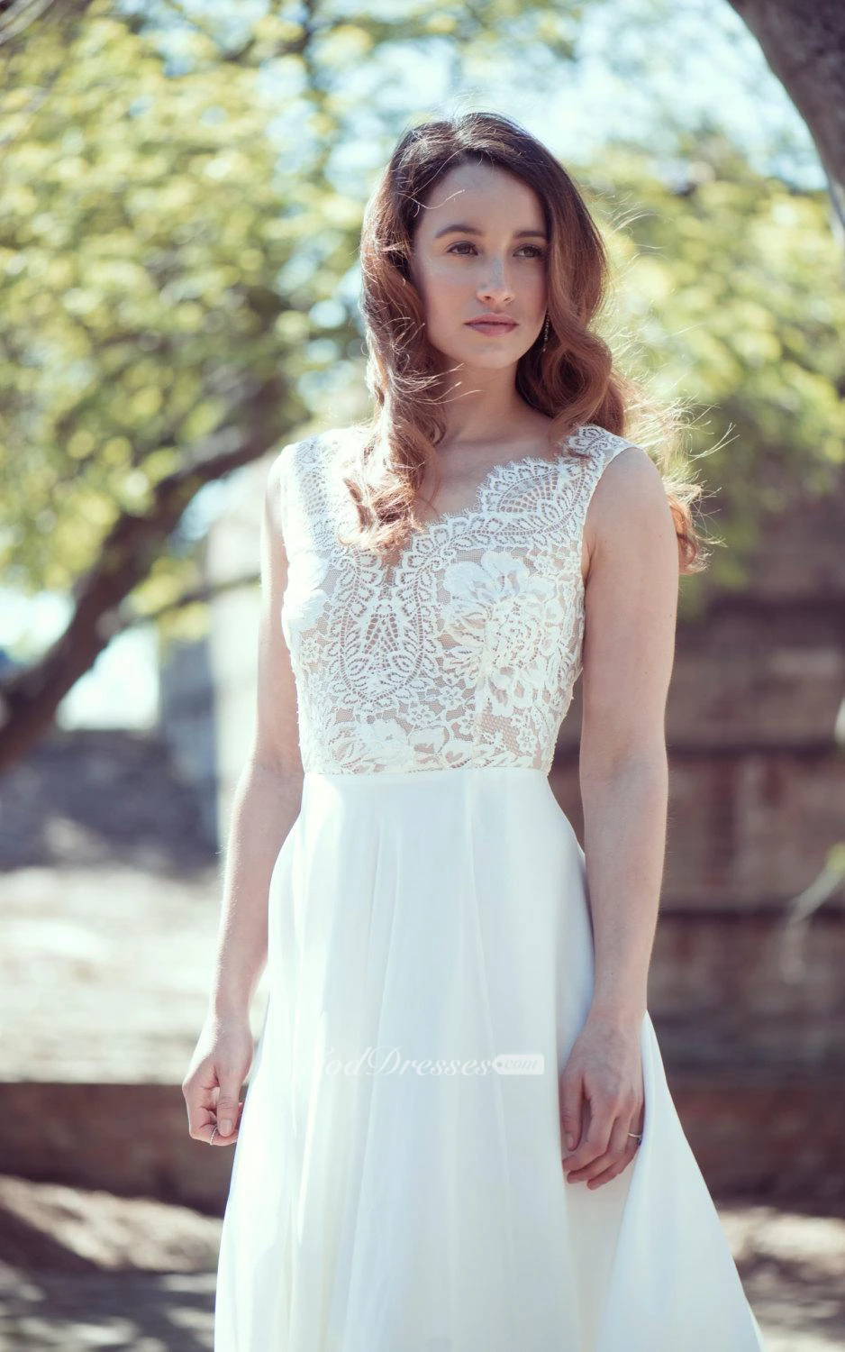 Lace and Chiffon Sleeveless A-Line Dress With Side Slit and V-Neck