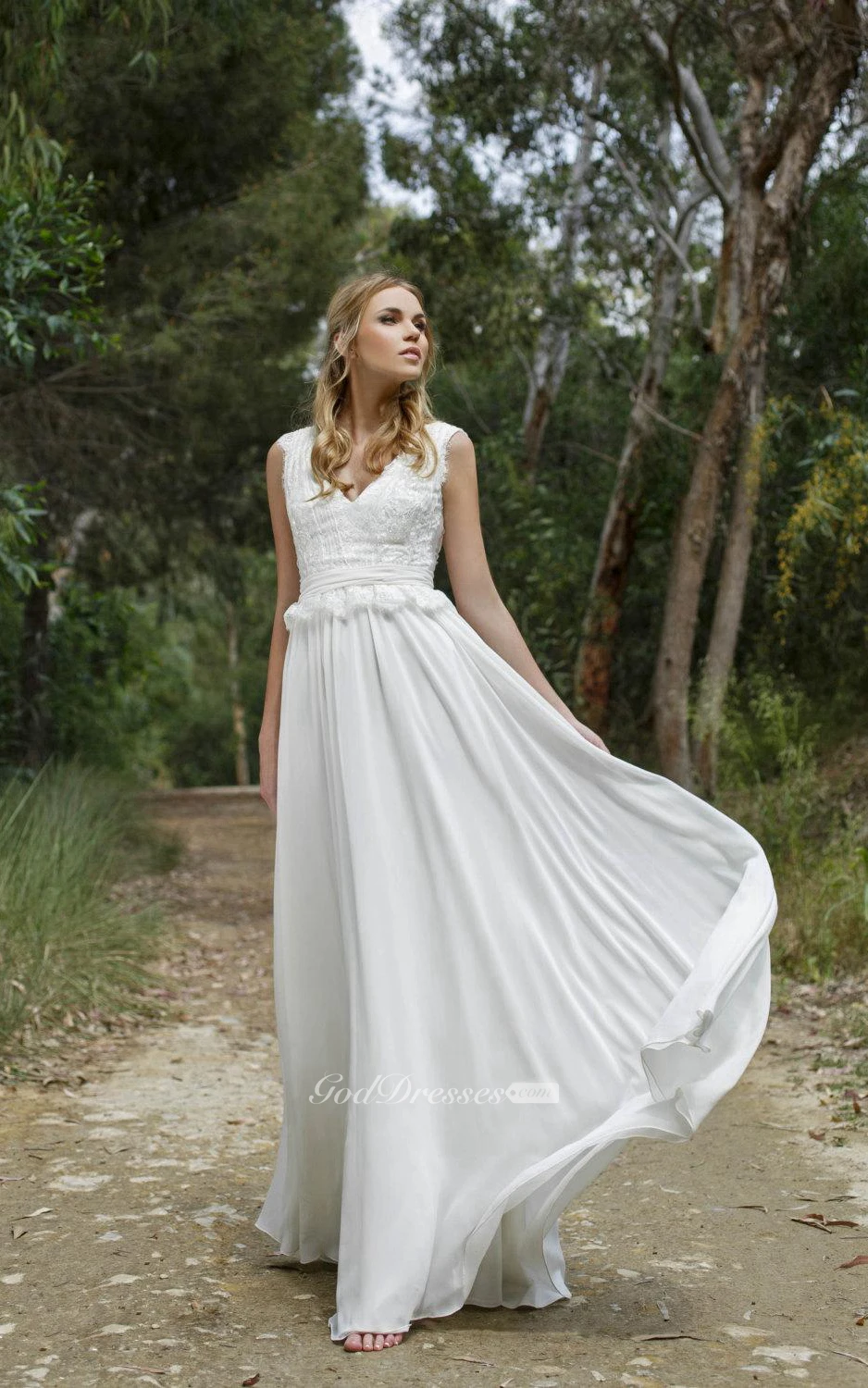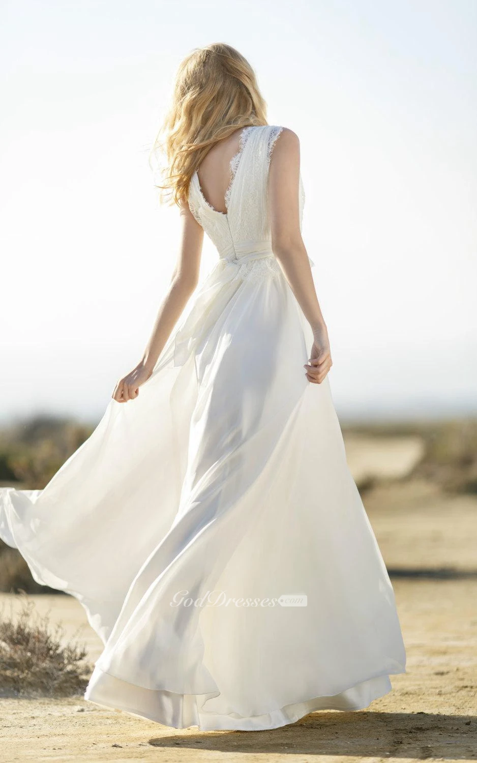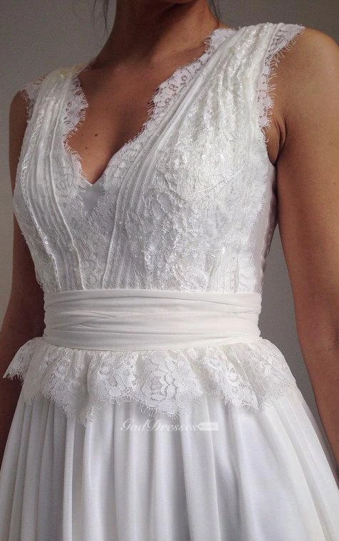 Lace and Chiffon V-Neck Sleeveless Dress With Low-V Back