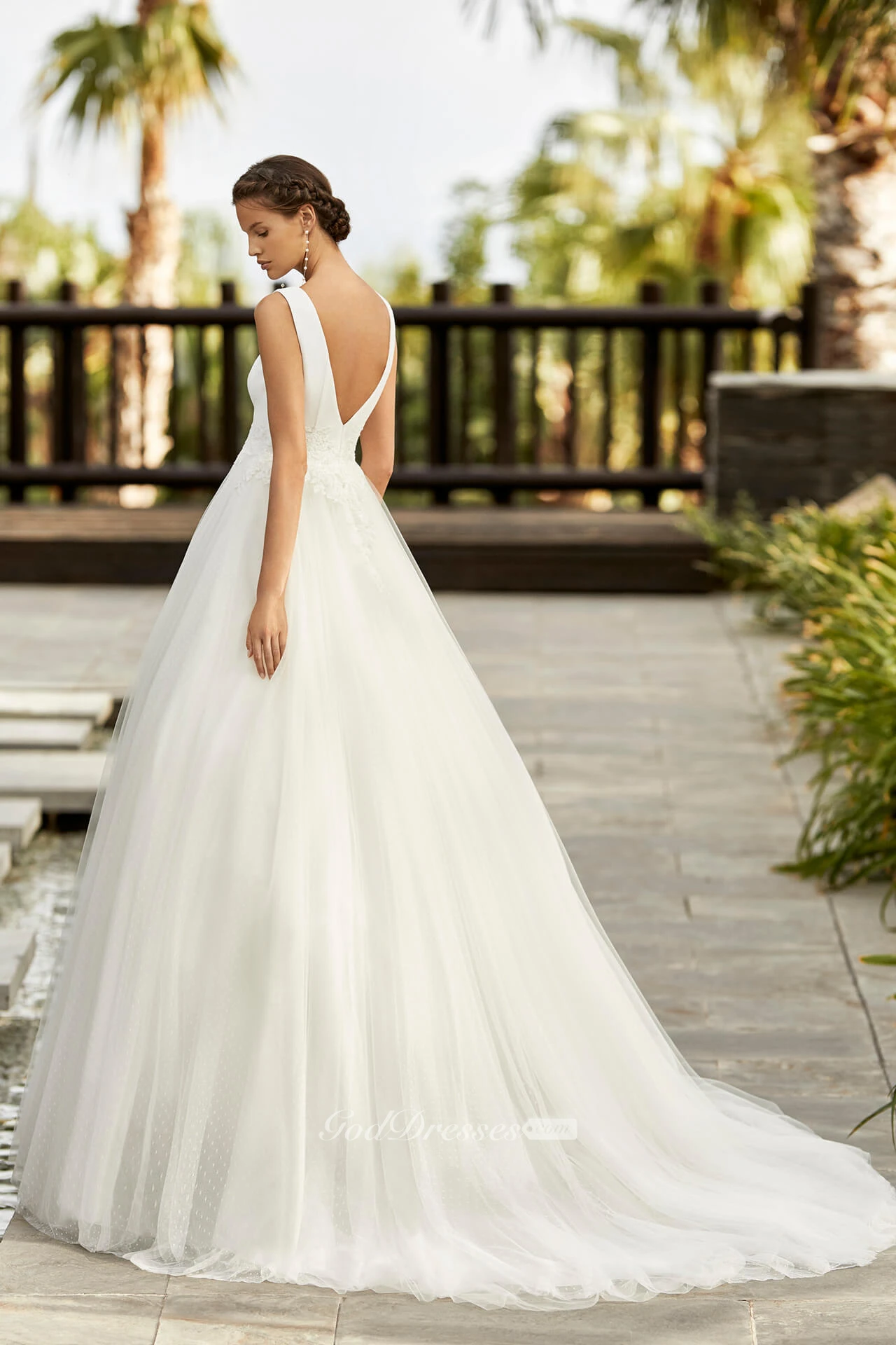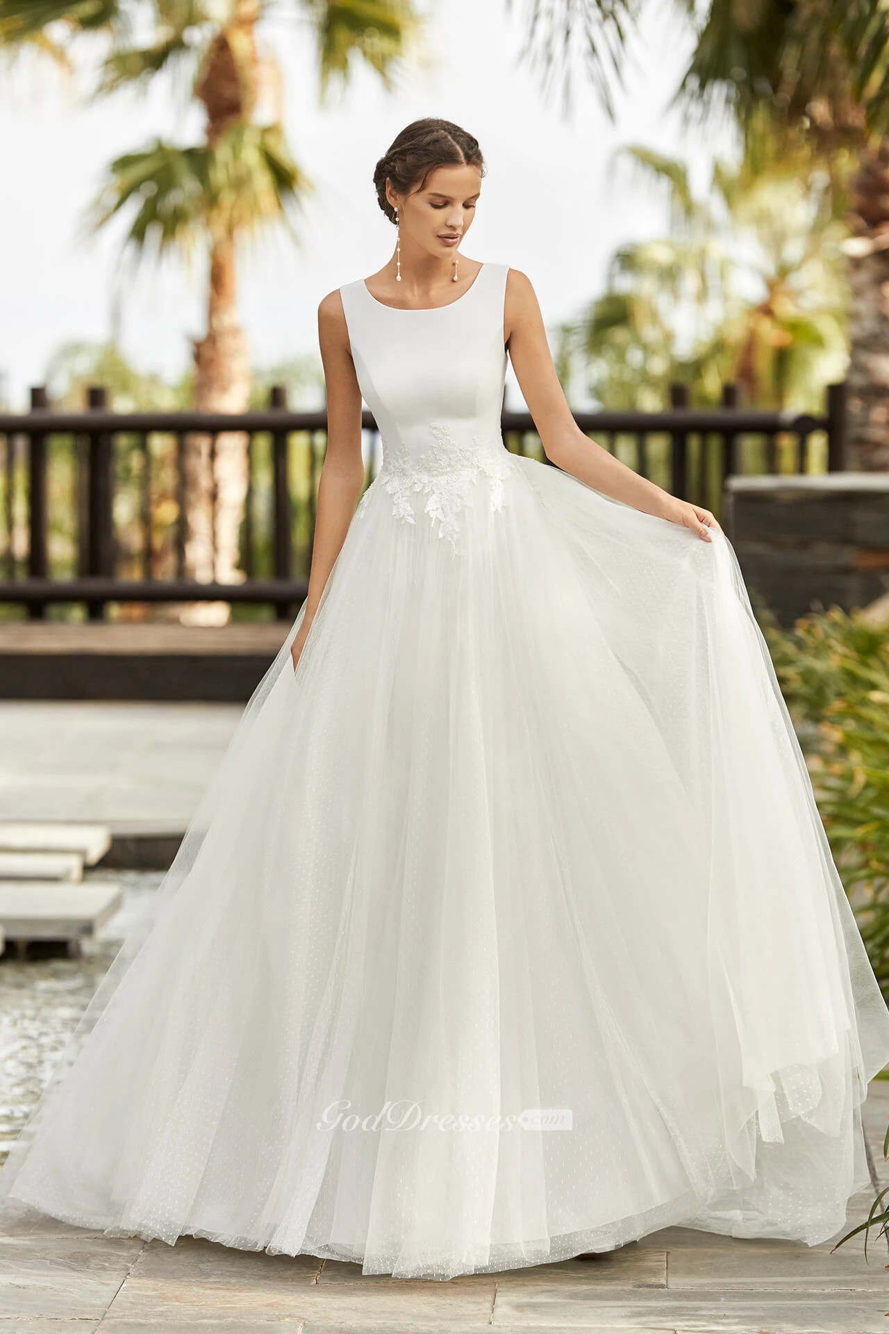 Lace Appliqued Scoop Neckline Sleeveless And Deep V-back Ballgown Tulle Wedding Dress