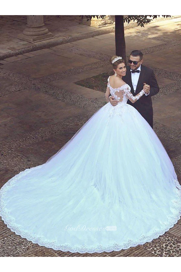 Lace Ball Gown Tulle Long Sleeves Off-the-shoulder Court Train Wedding Dresses