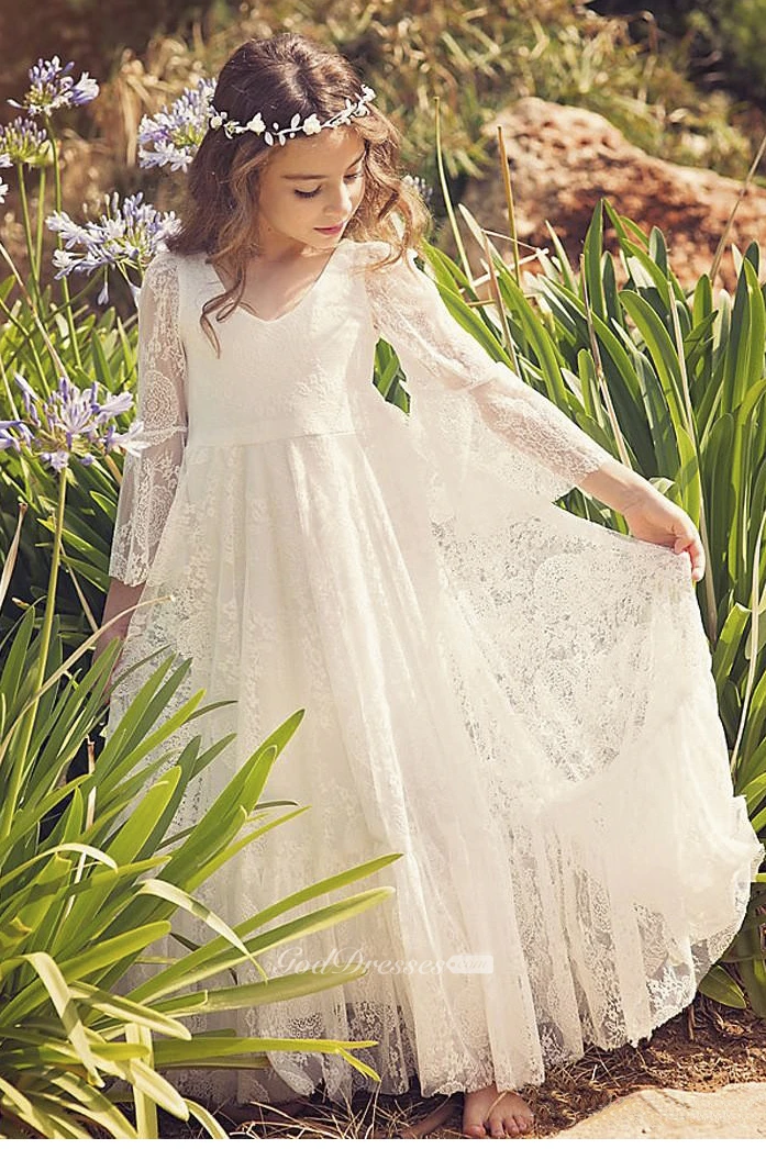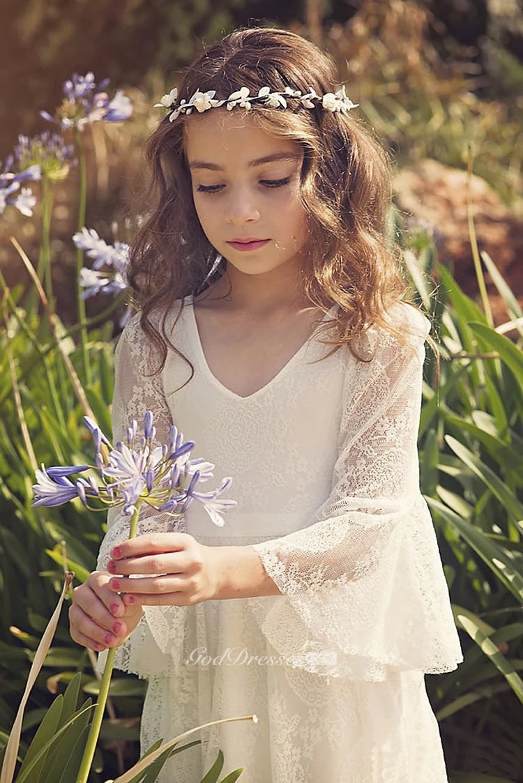 Lace Bohemian Simple Flower Girl Dress With Bell Sleeves