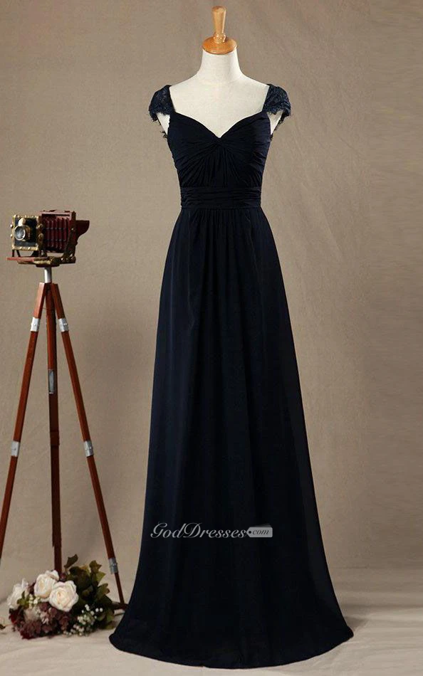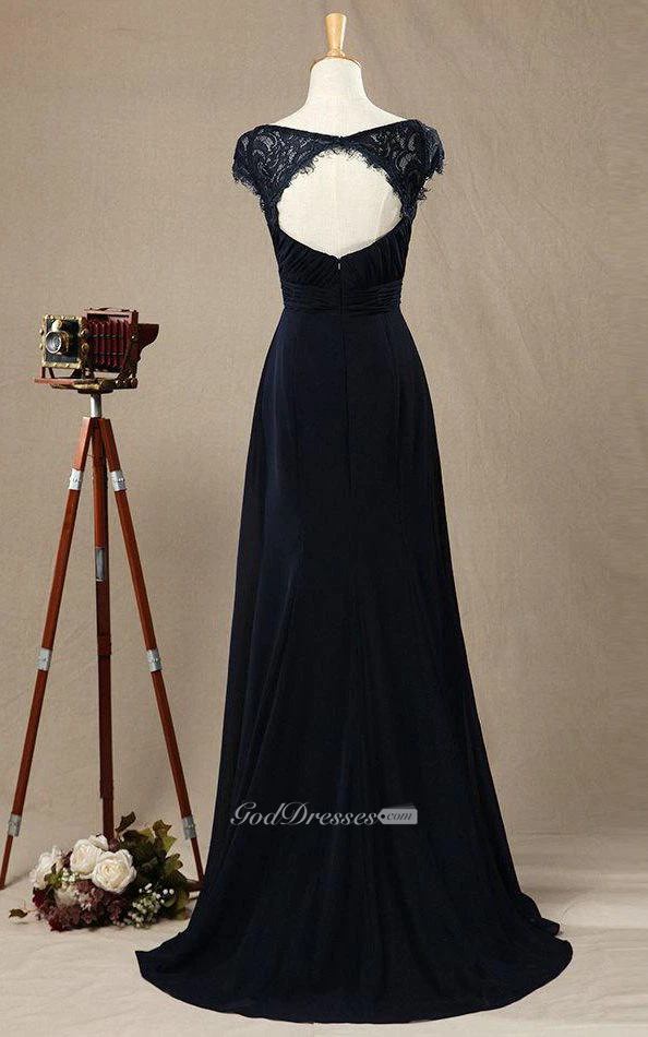 Lace Cap Sleeve A-line Chiffon Long Dress With Back Keyhole