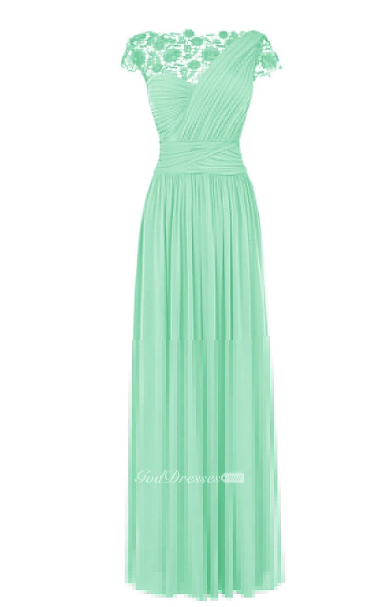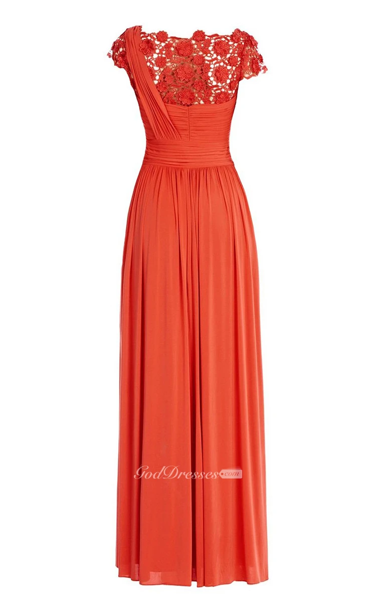 Lace Cap-sleeve One-shoulder Pleated Chiffon A-line Dress