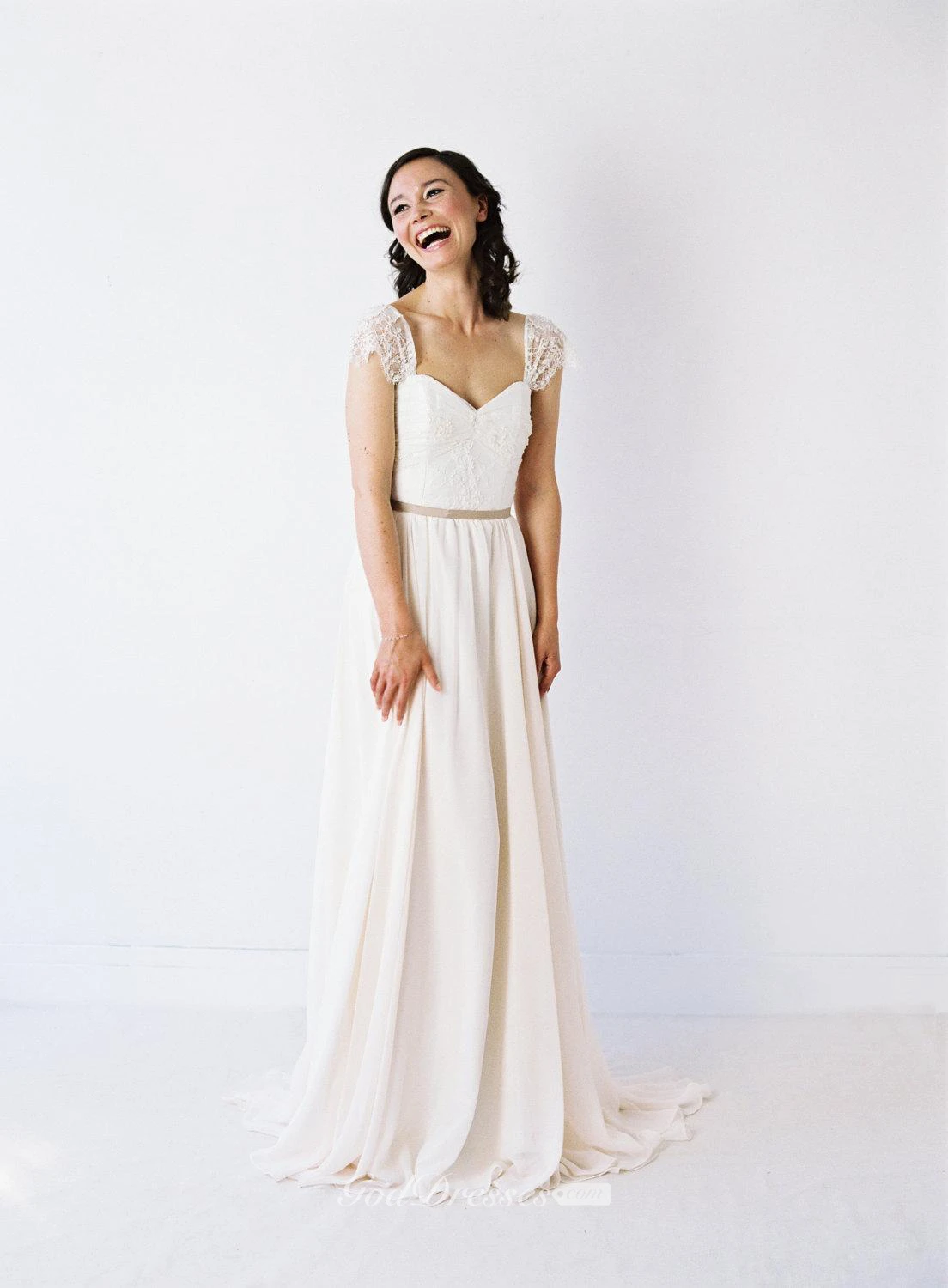 Lace Cap Sleeve V-Neck A-Line Chiffon Dress With Square Open Back