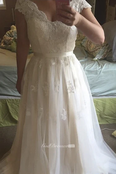 Lace Cap-sleeved Tulle A-line Gown With Scalloped Neck