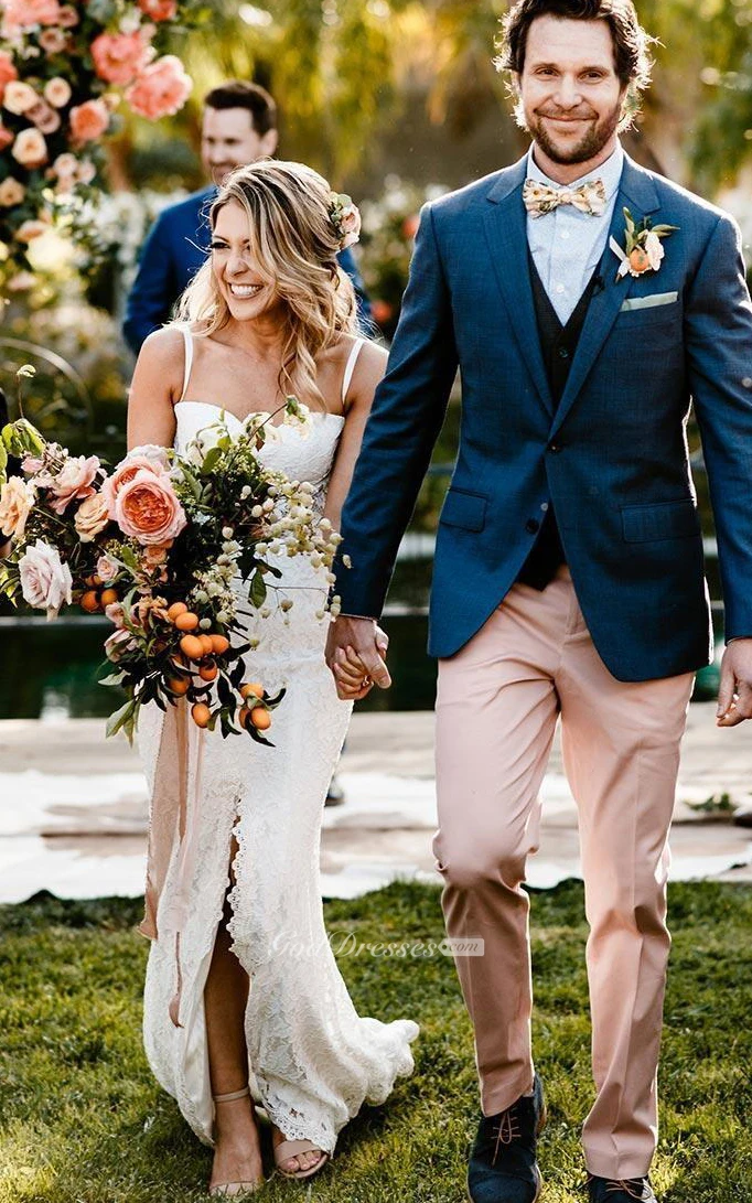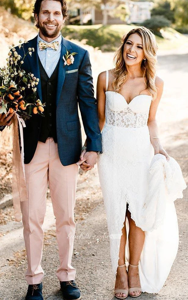 Lace Floor-length Spaghetti Sheath Sleeveless Ethereal Wedding Dress with Split Front