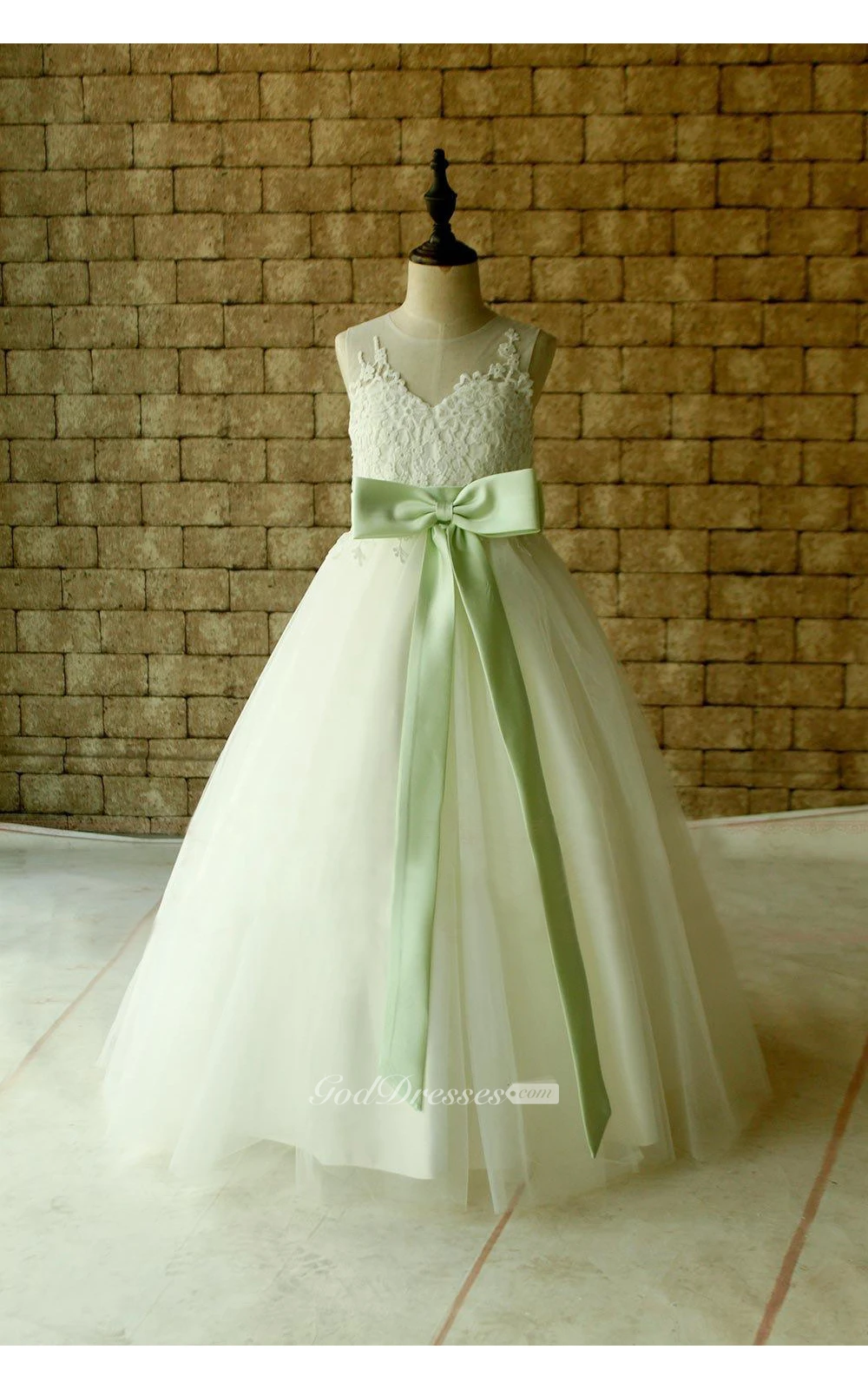 Lace Illusion Neckline Pleated Tulle Ball Gown With Keyhole and Bows