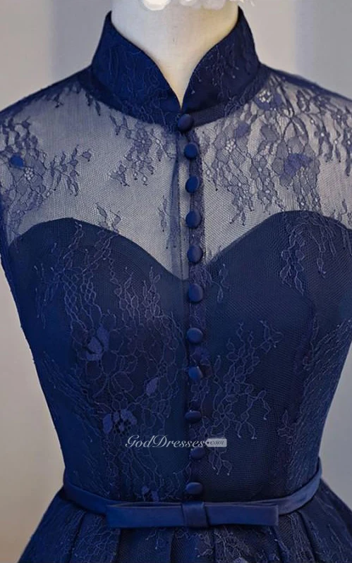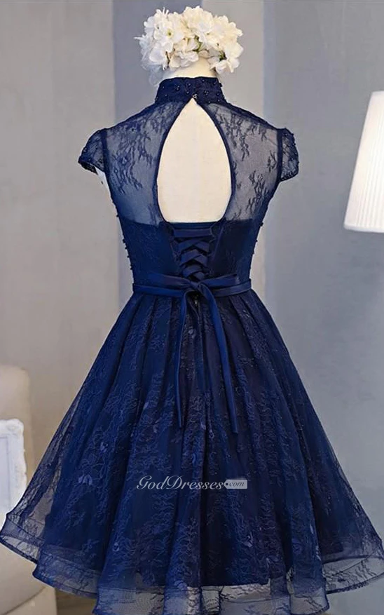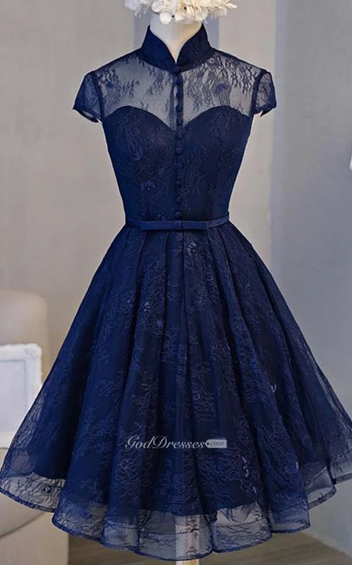 Lace Knee-length A Line Short Sleeve Modest Formal Dress with Ribbon
