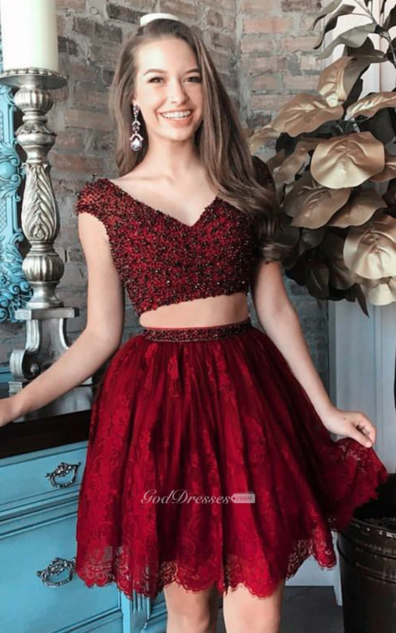Lace Short Two Piece Short Sleeve Adorable Homecoming Dress with Pleats