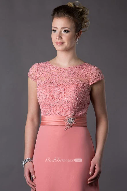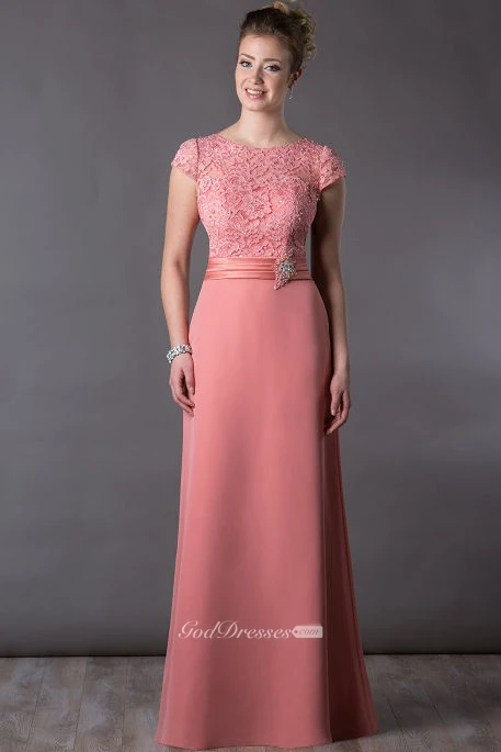 Lace Top Cap Sleeve Long Mother Of The Bride Dress With Crystal And Pearl Waist