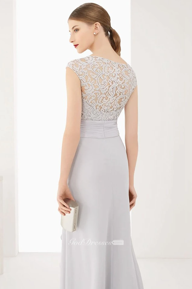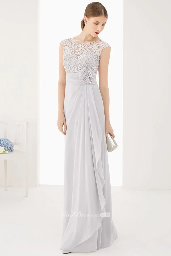 Lace Top Cap Sleeve Side Drape Chiffon Long Dress With Waist Flower