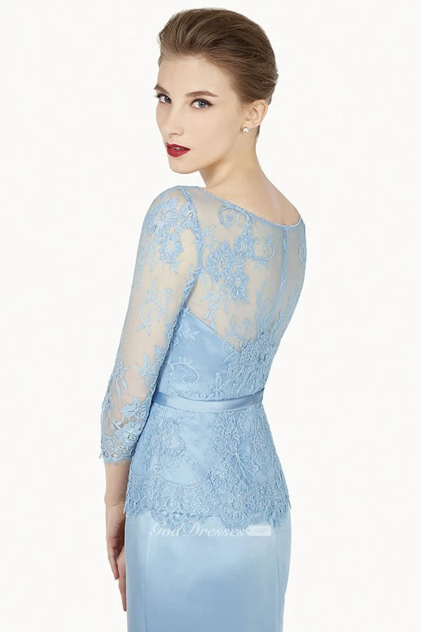 Lace Top Scoop Neck Satin Long Prom Dress With 3-4 Sleeve And Floral Satin Sash