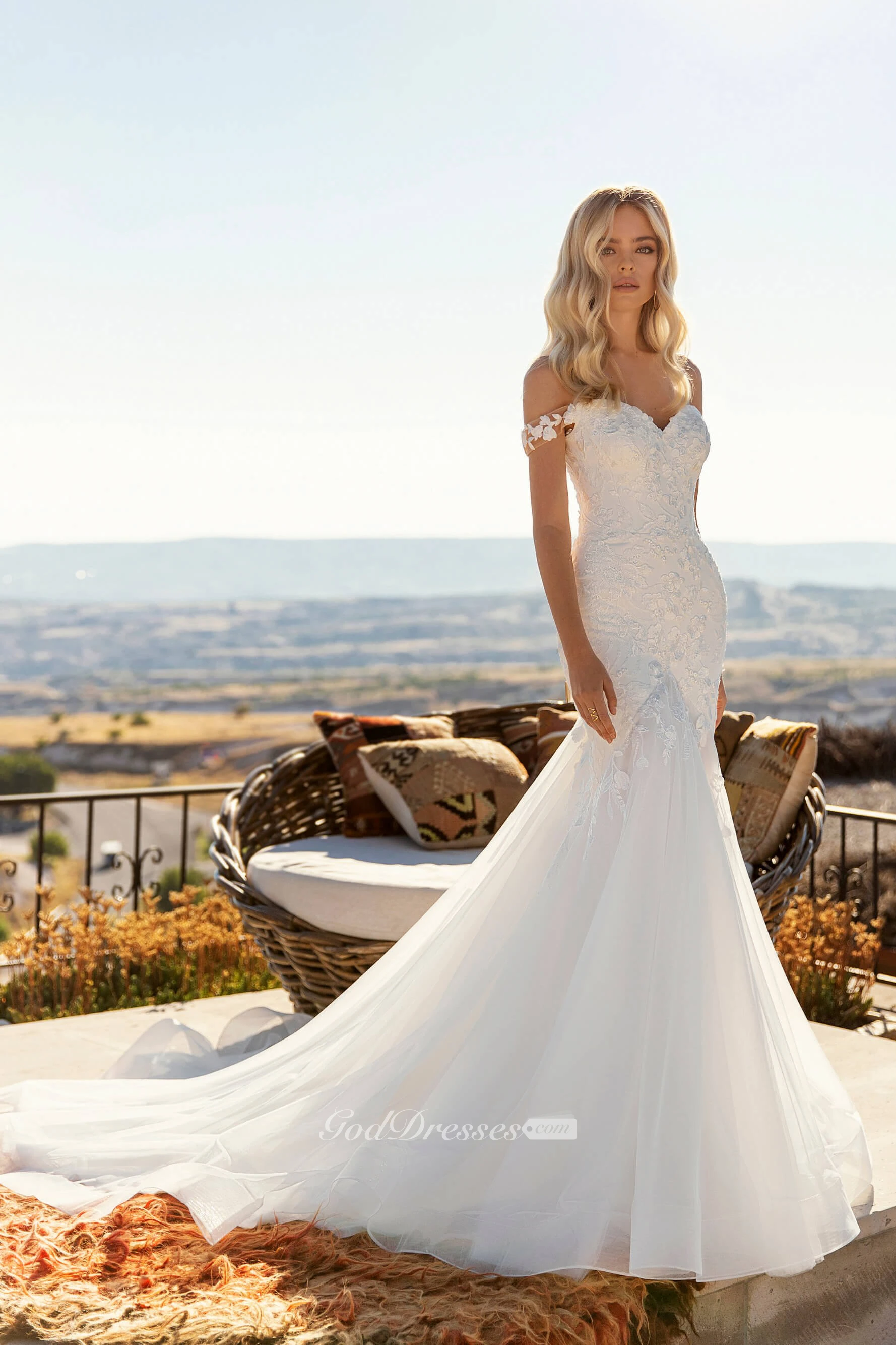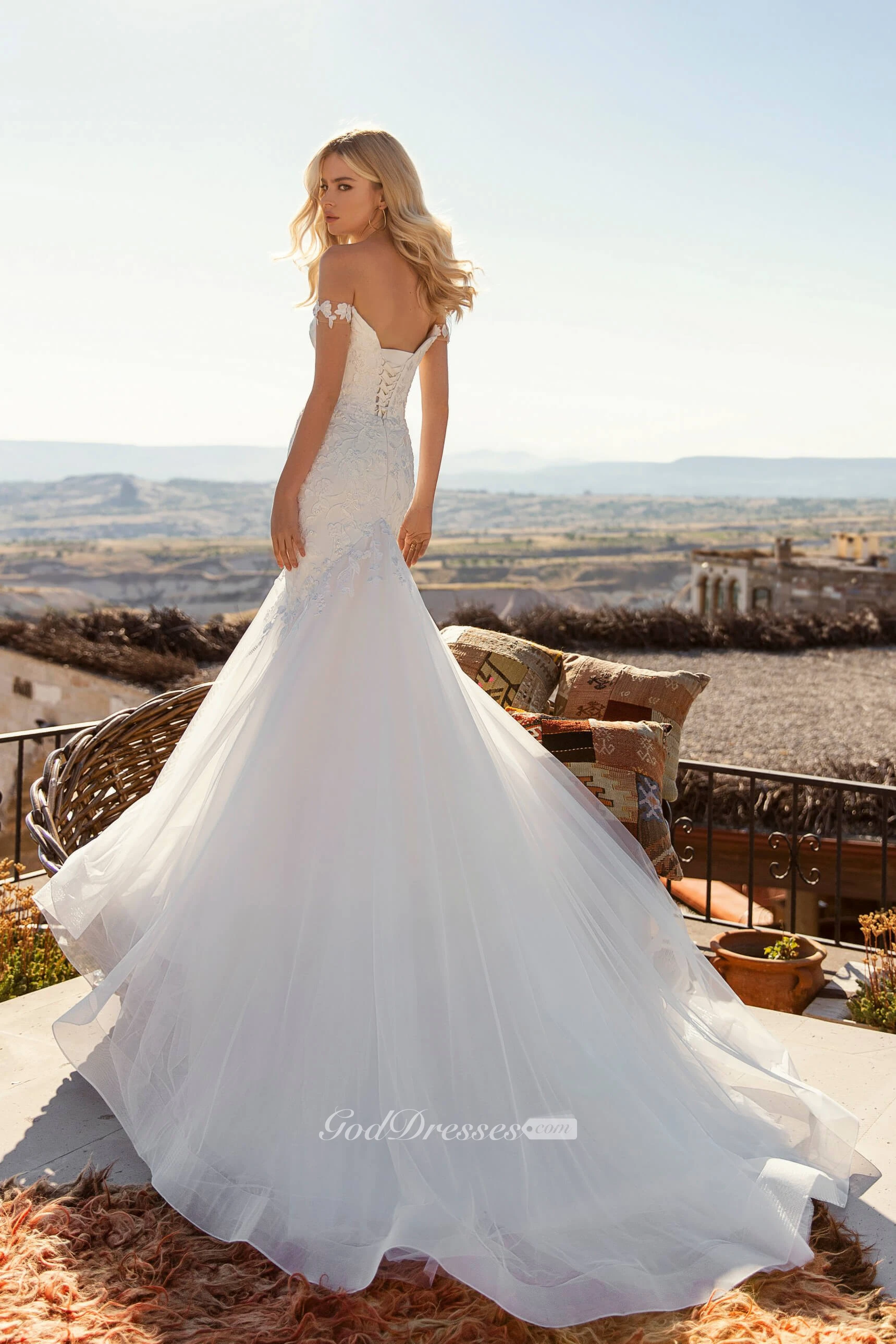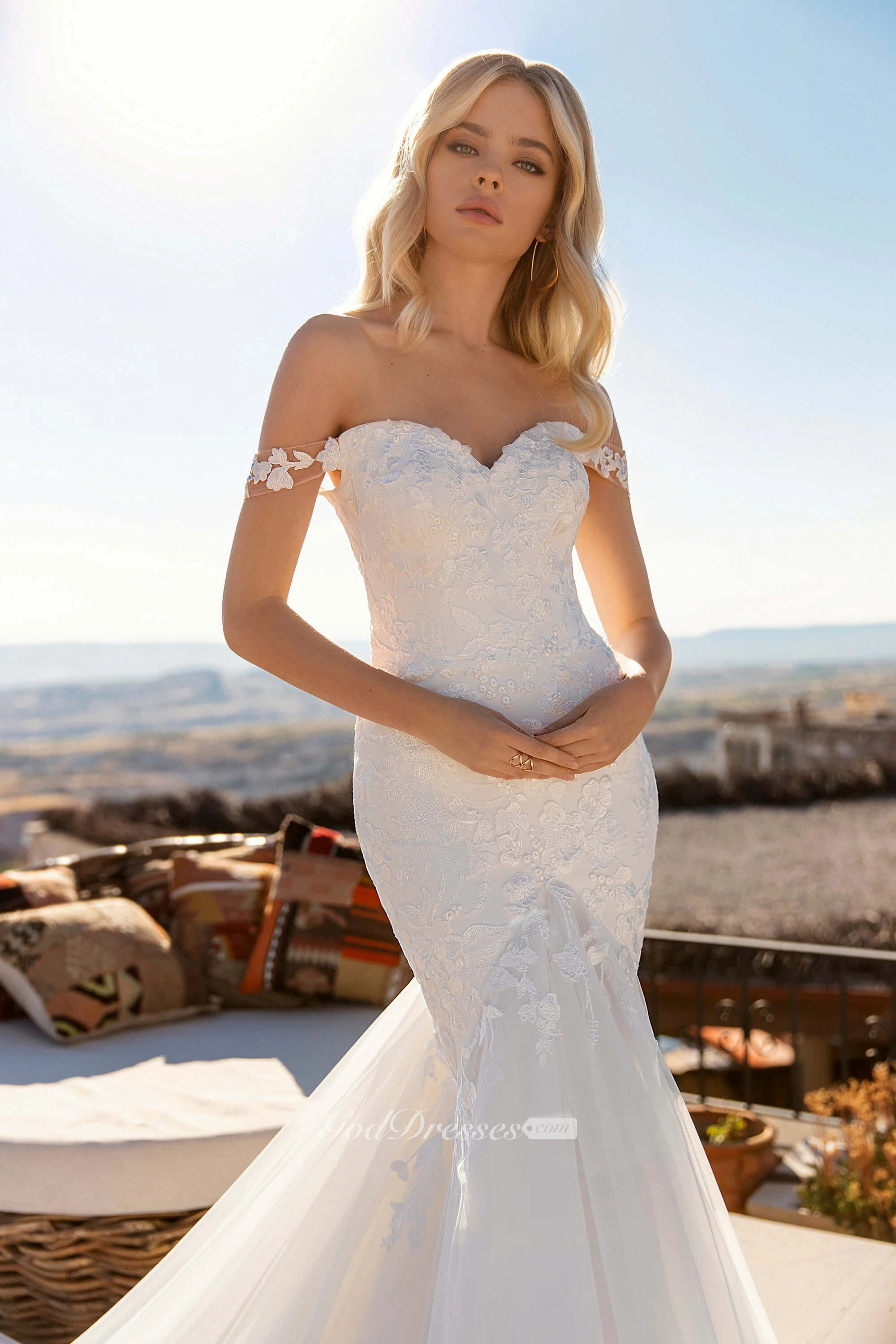 Lace Tulle Corset Back With Chapel Train Off-the-shoulder Sexy Mermaid Wedding Dress