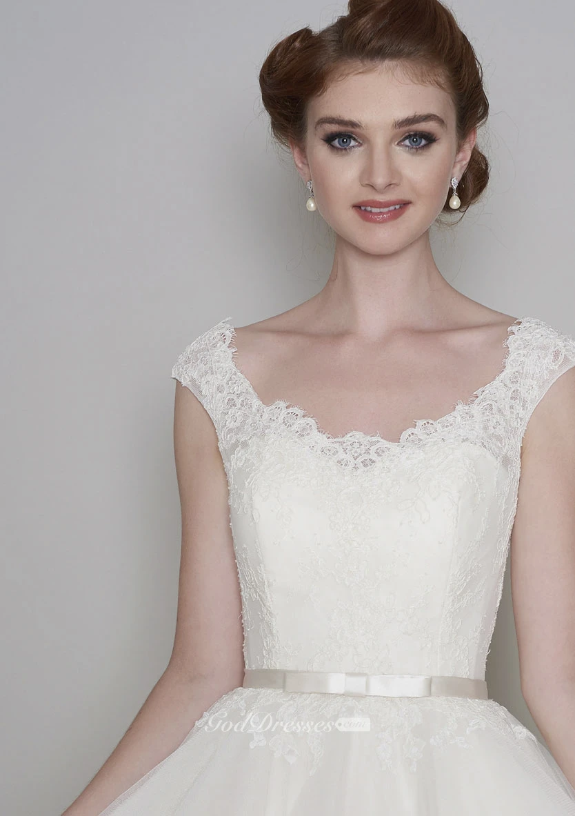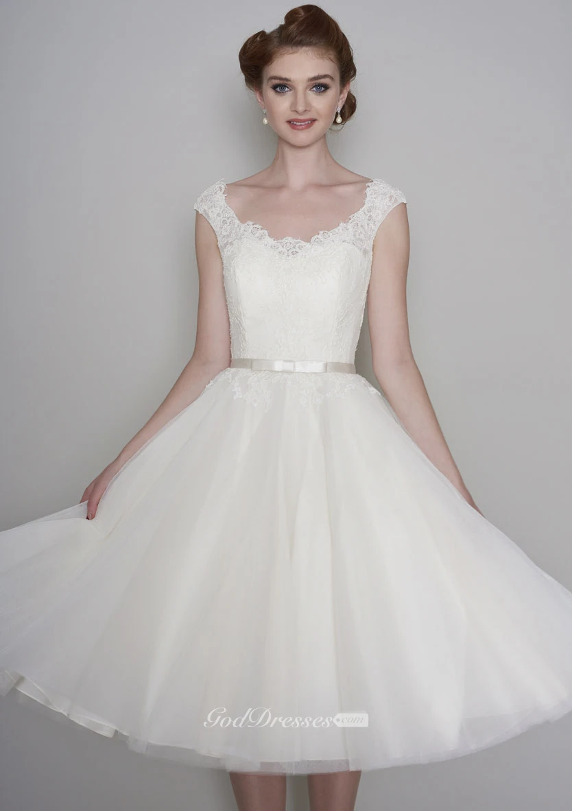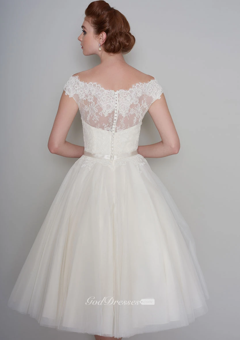 Lace Vintage Cap Sleeve Tea length V-neck Tulle Wedding Dress With Buttons