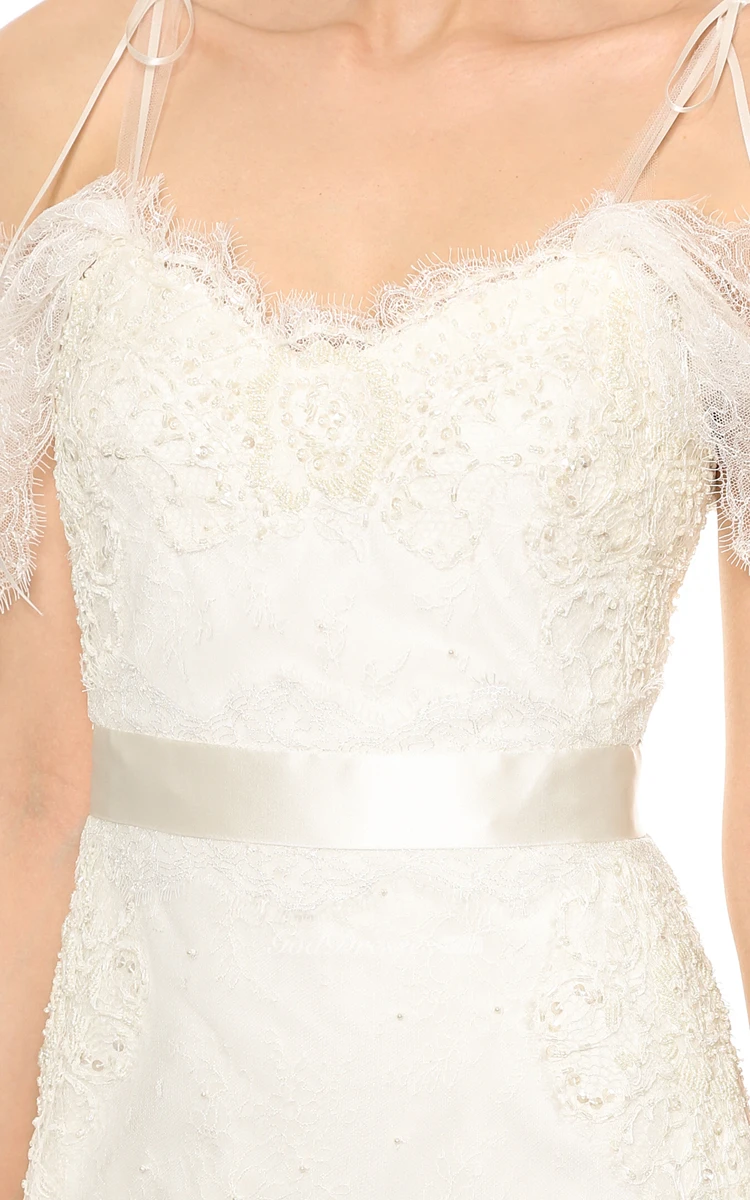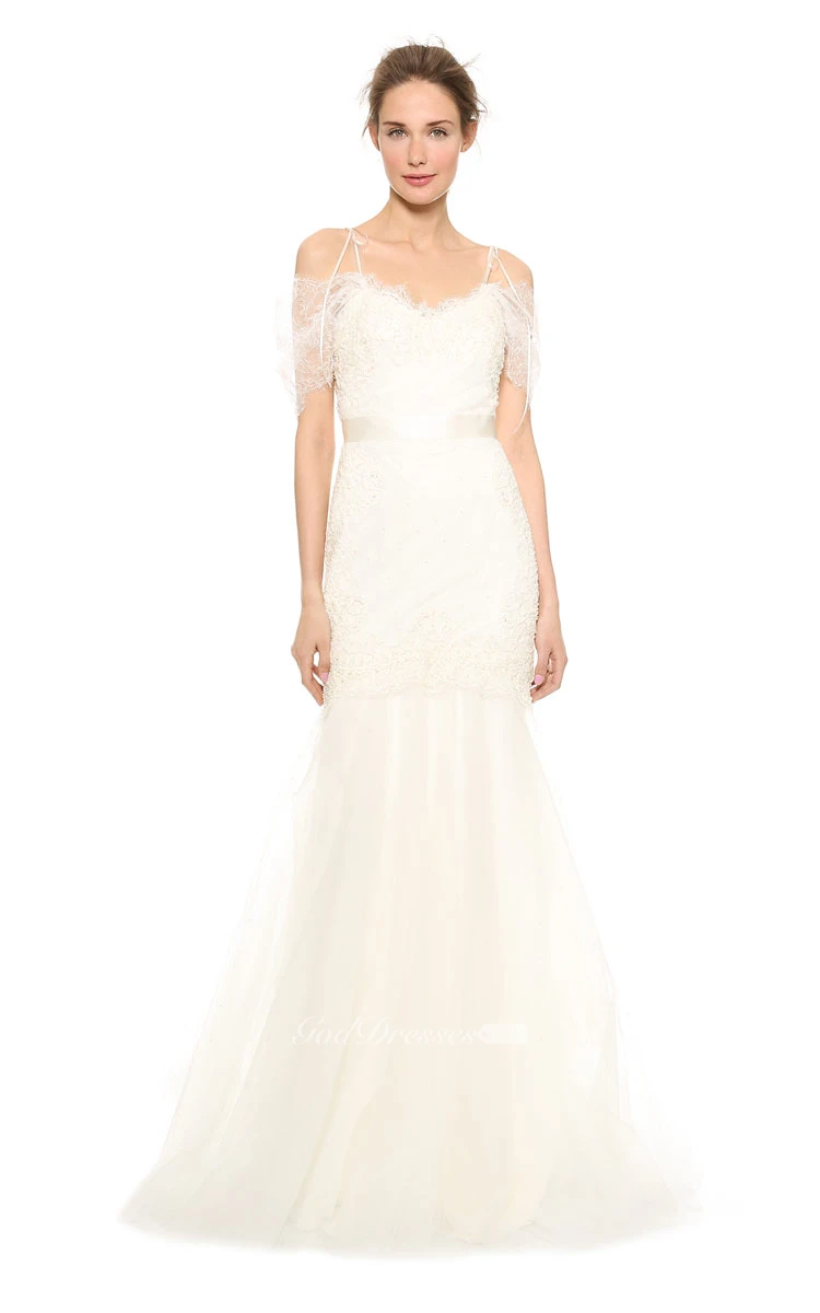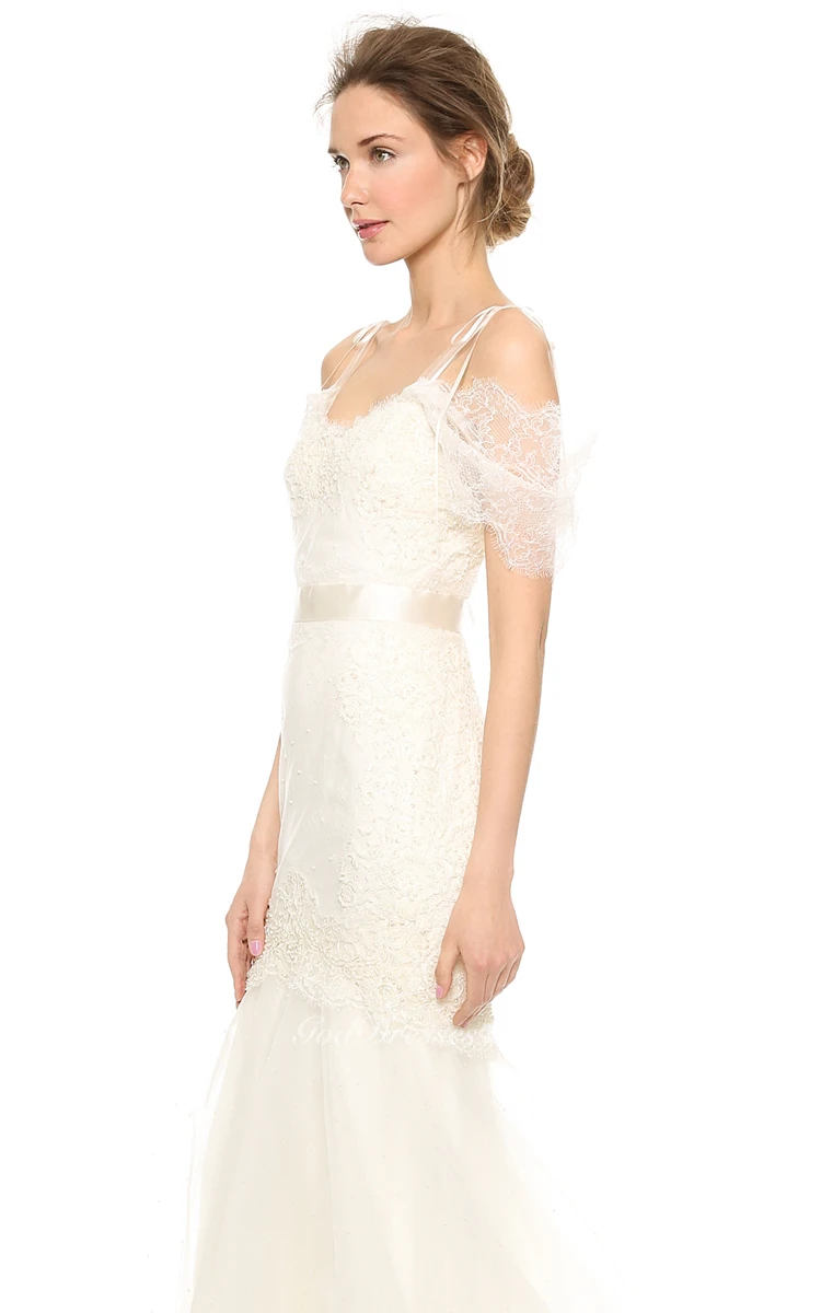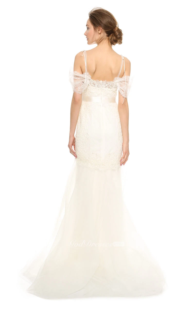 Long A-line Organza Dress With Satin Sash and Spaghette Straps