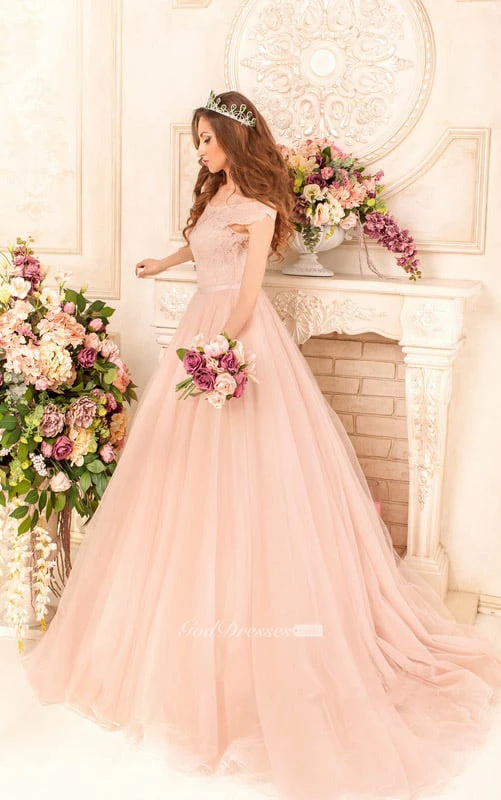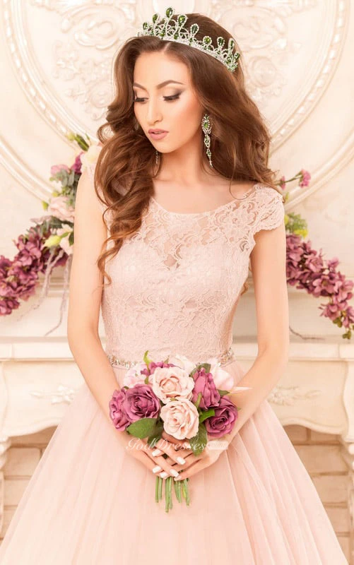 Long Bateau Neck Short Sleeve A-line Tulle Wedding Dress With Beaded Waist