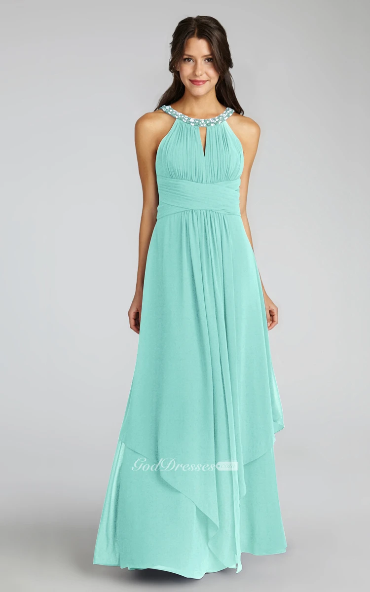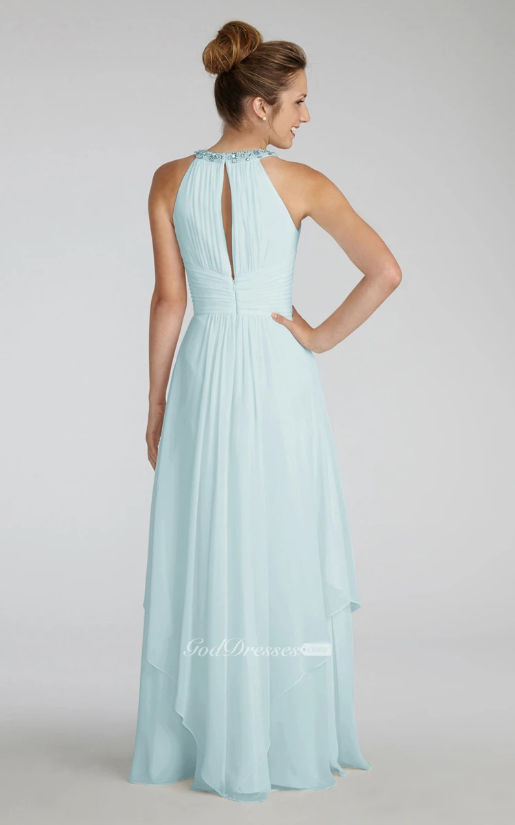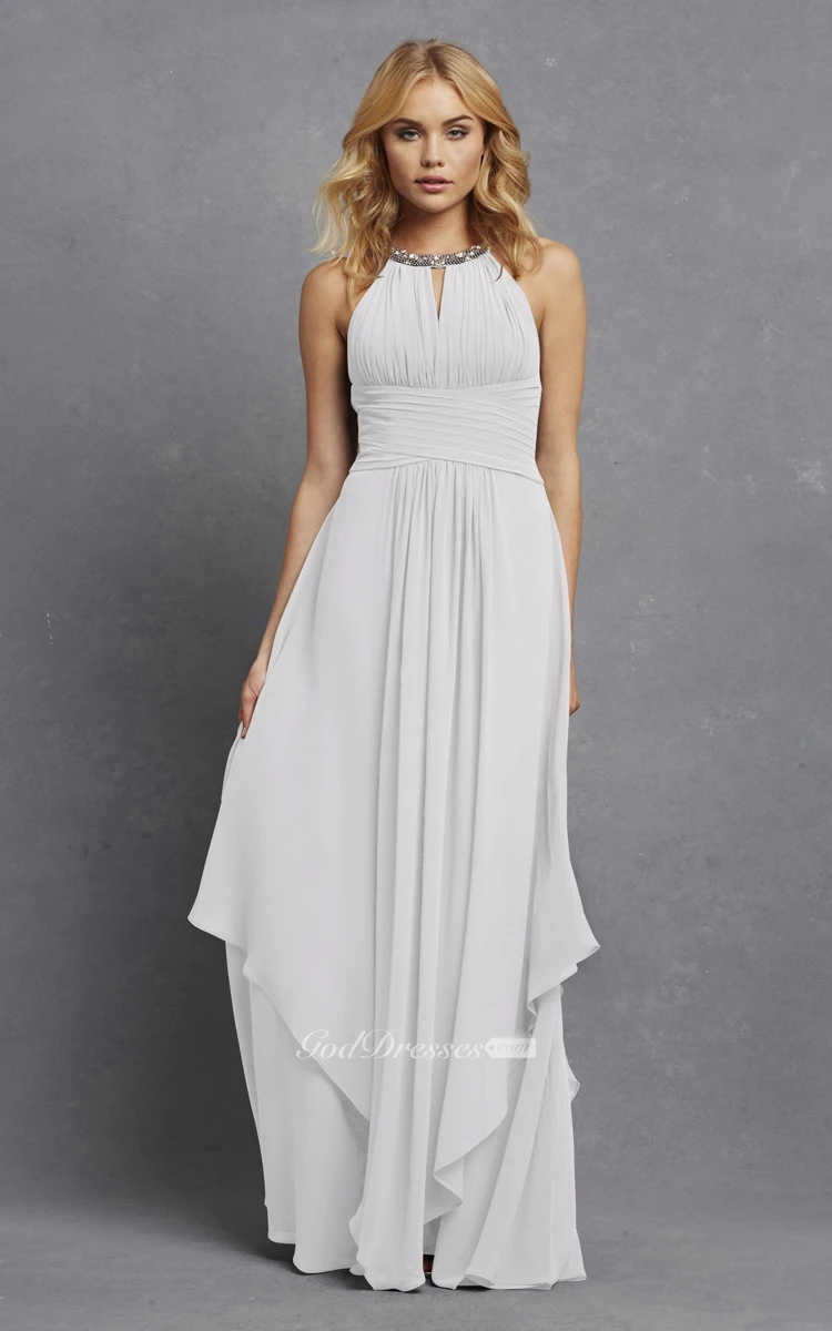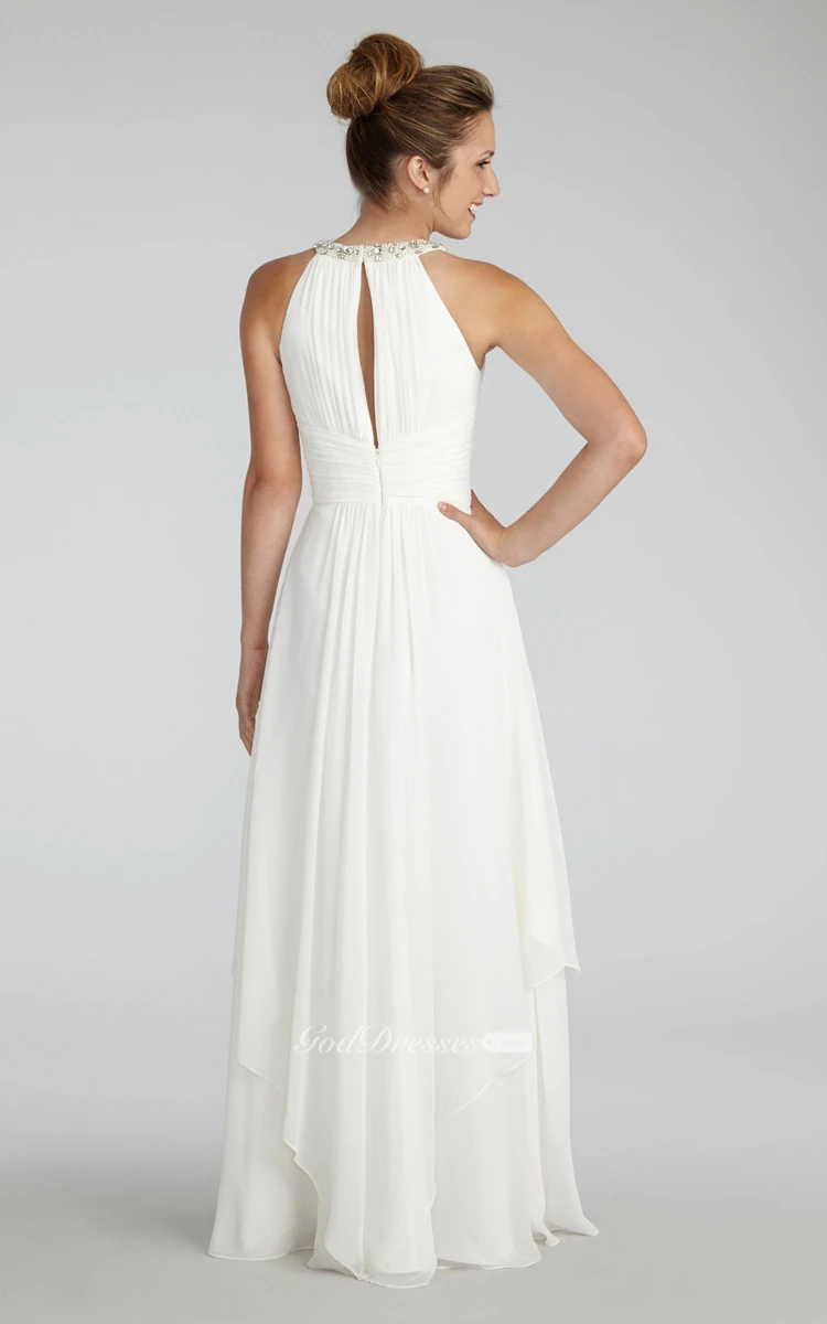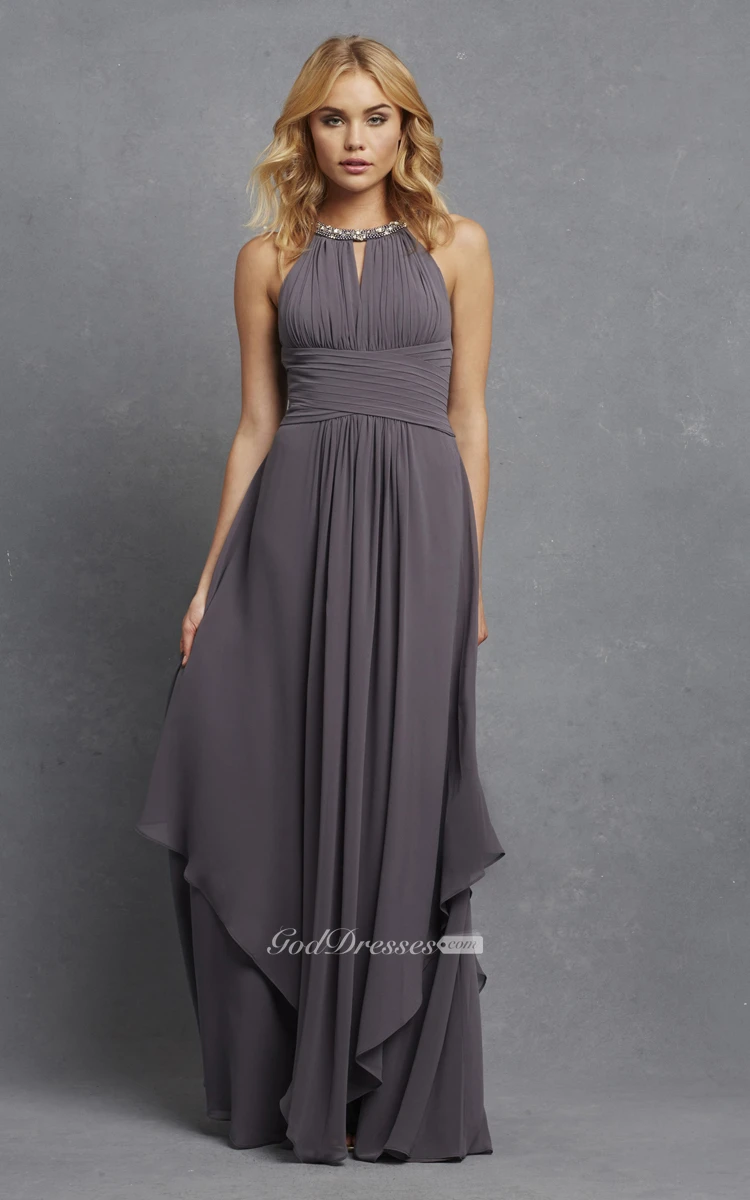 Long-Chiffon Jewel-Neck Unique Dress With Keyhole