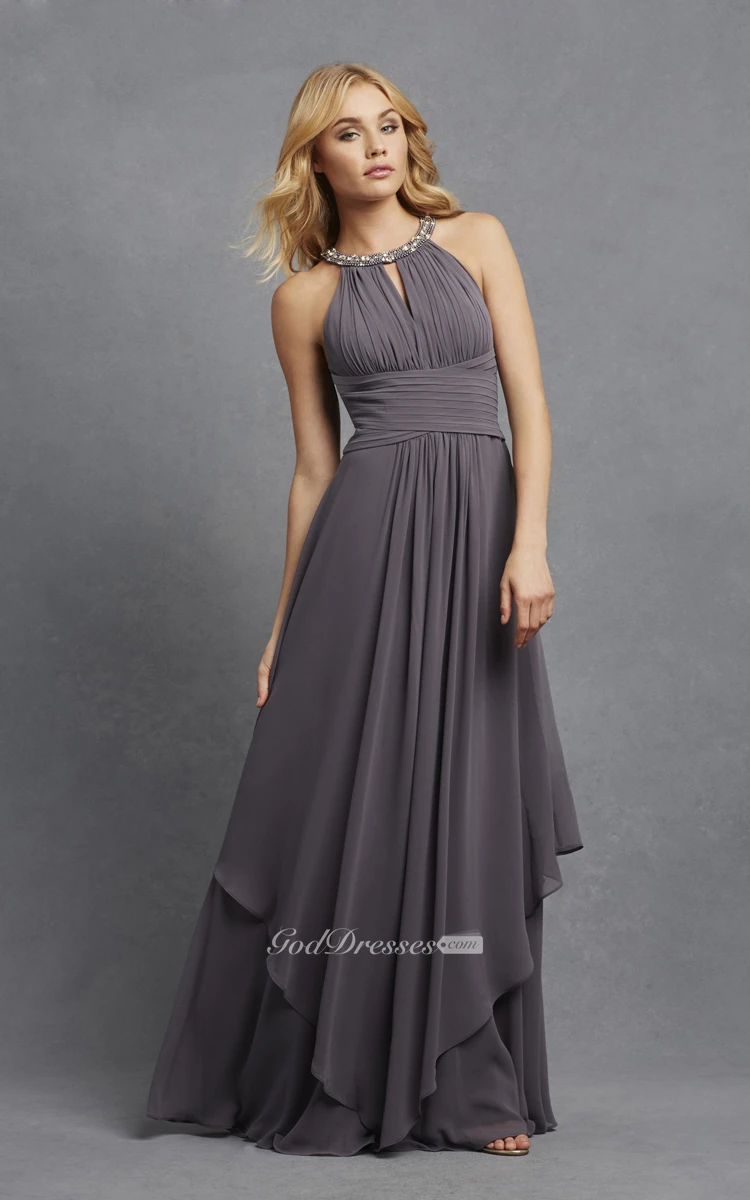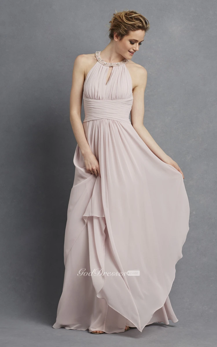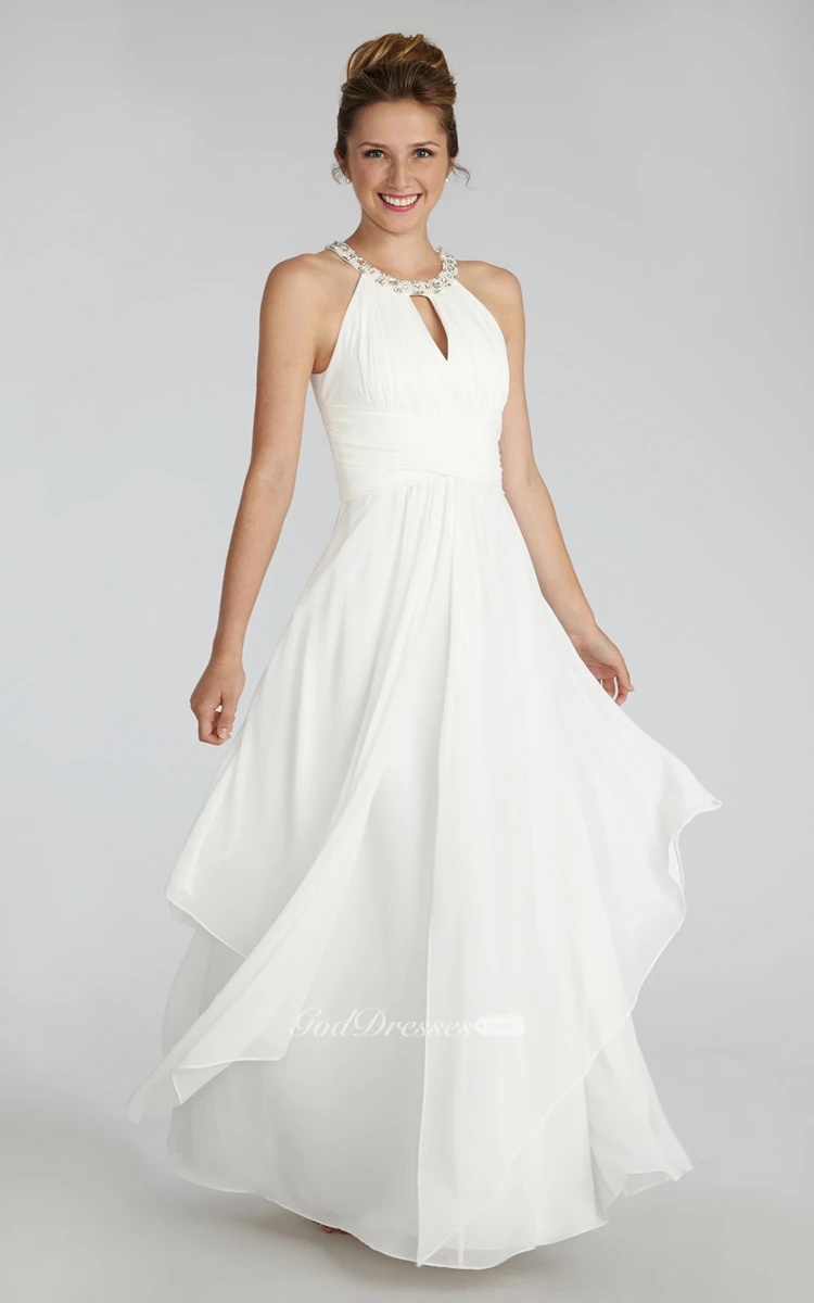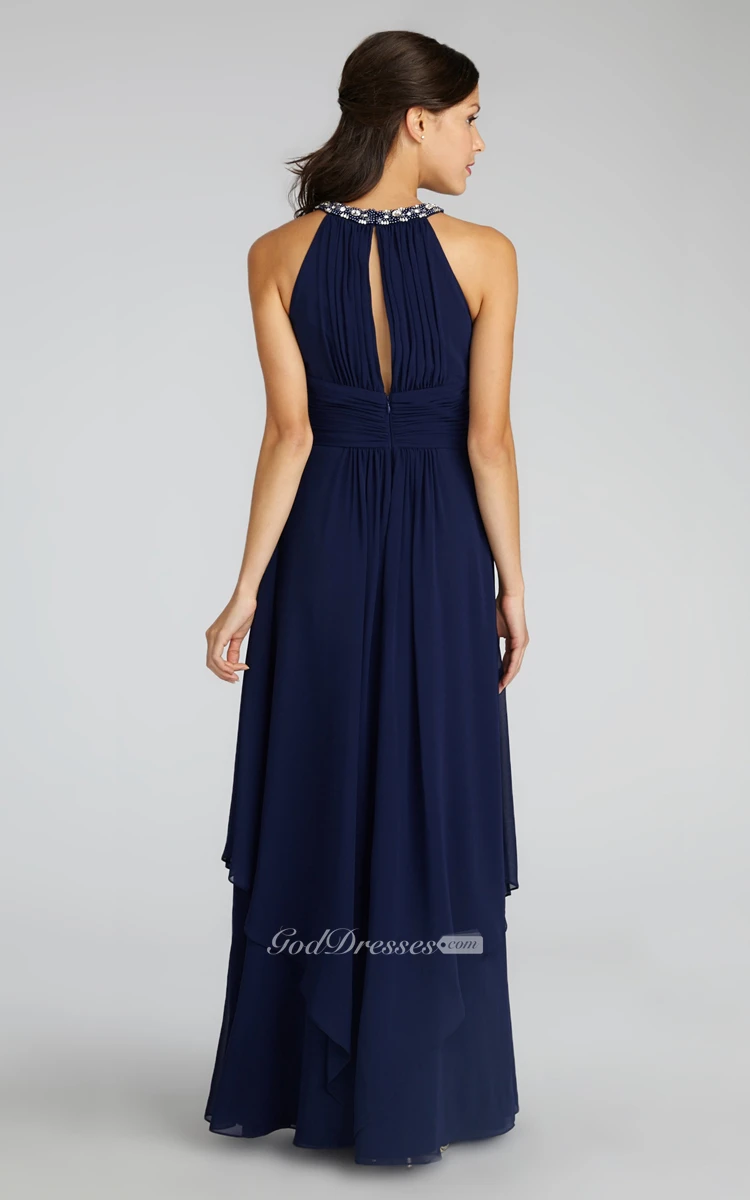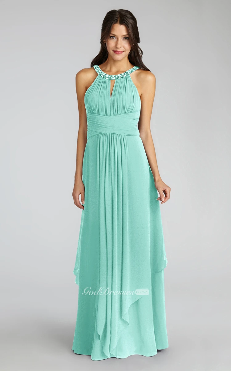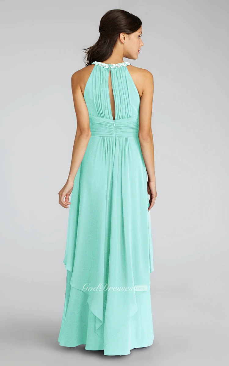 Long-Chiffon Jewel-Neck Unique Dress With Keyhole
