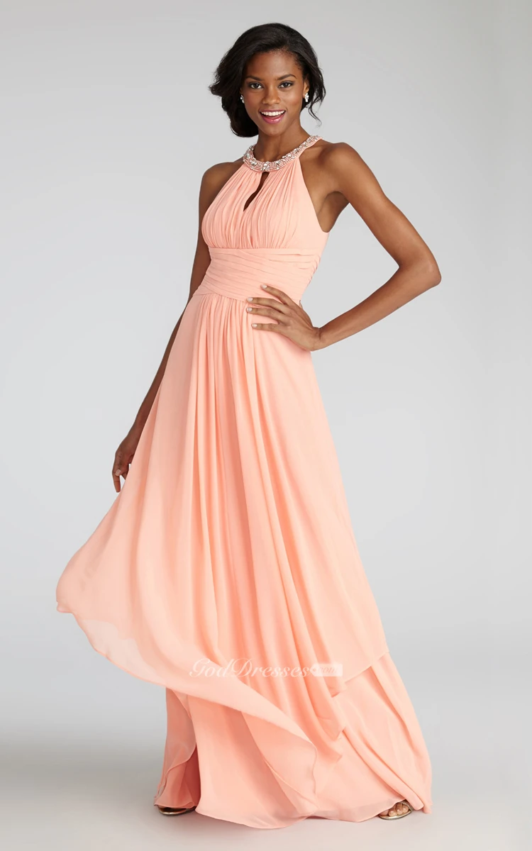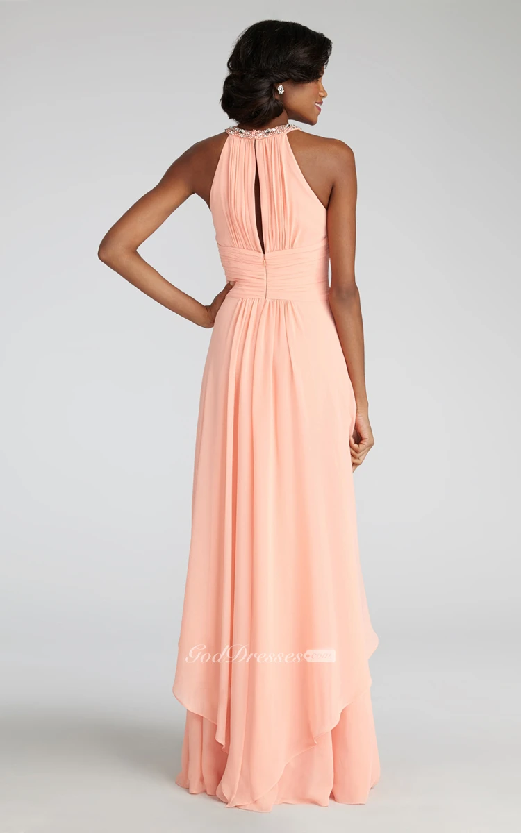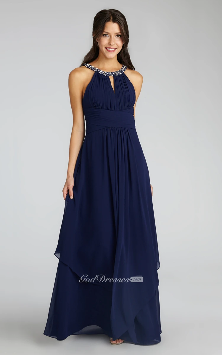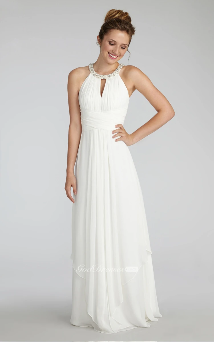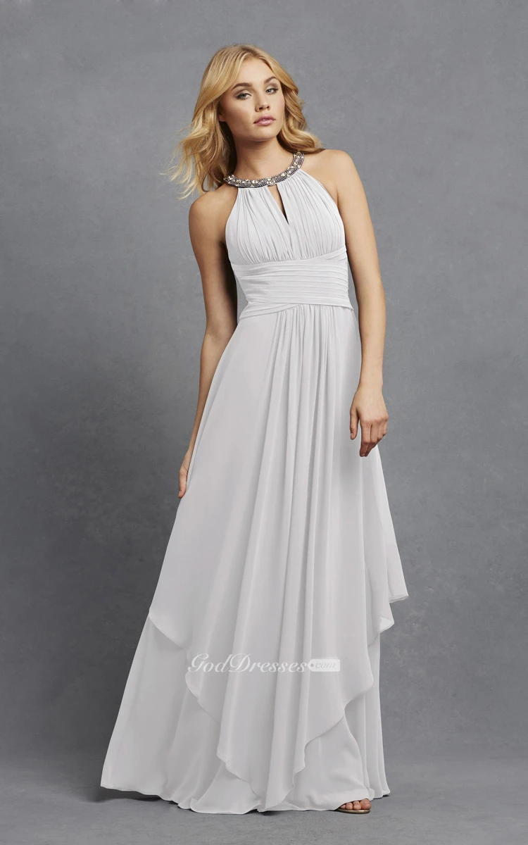 Long-Chiffon Jewel-Neck Unique Dress With Keyhole