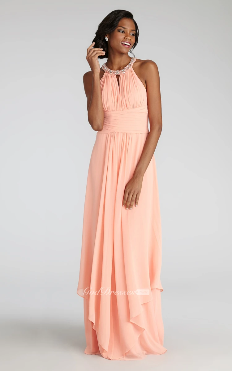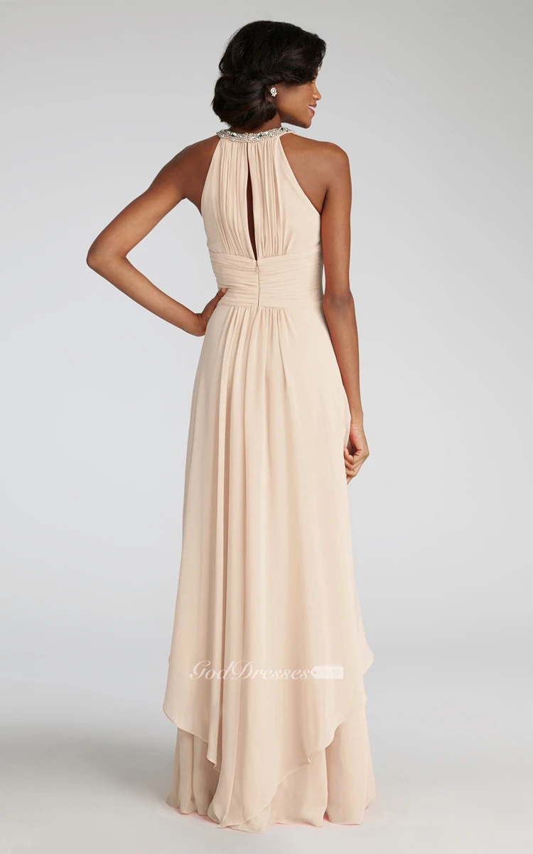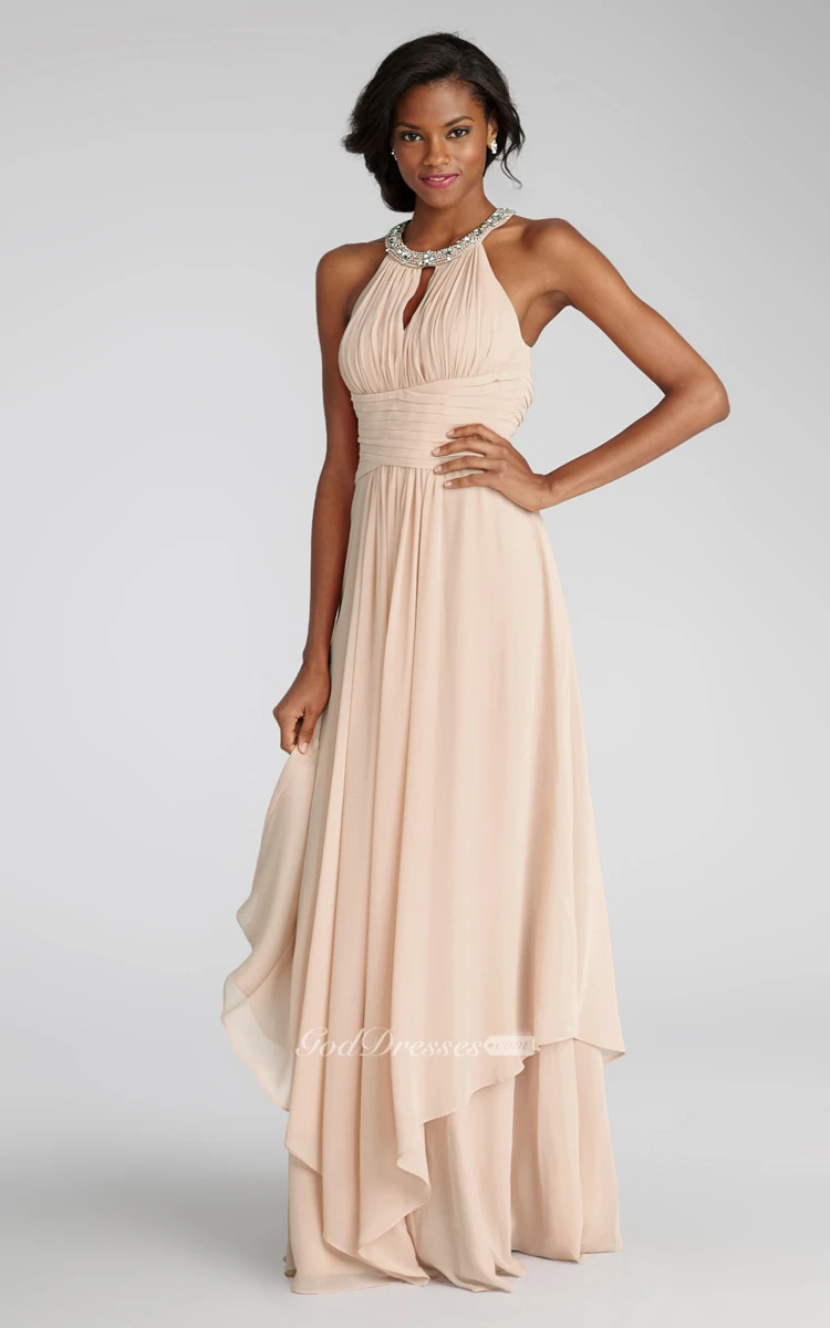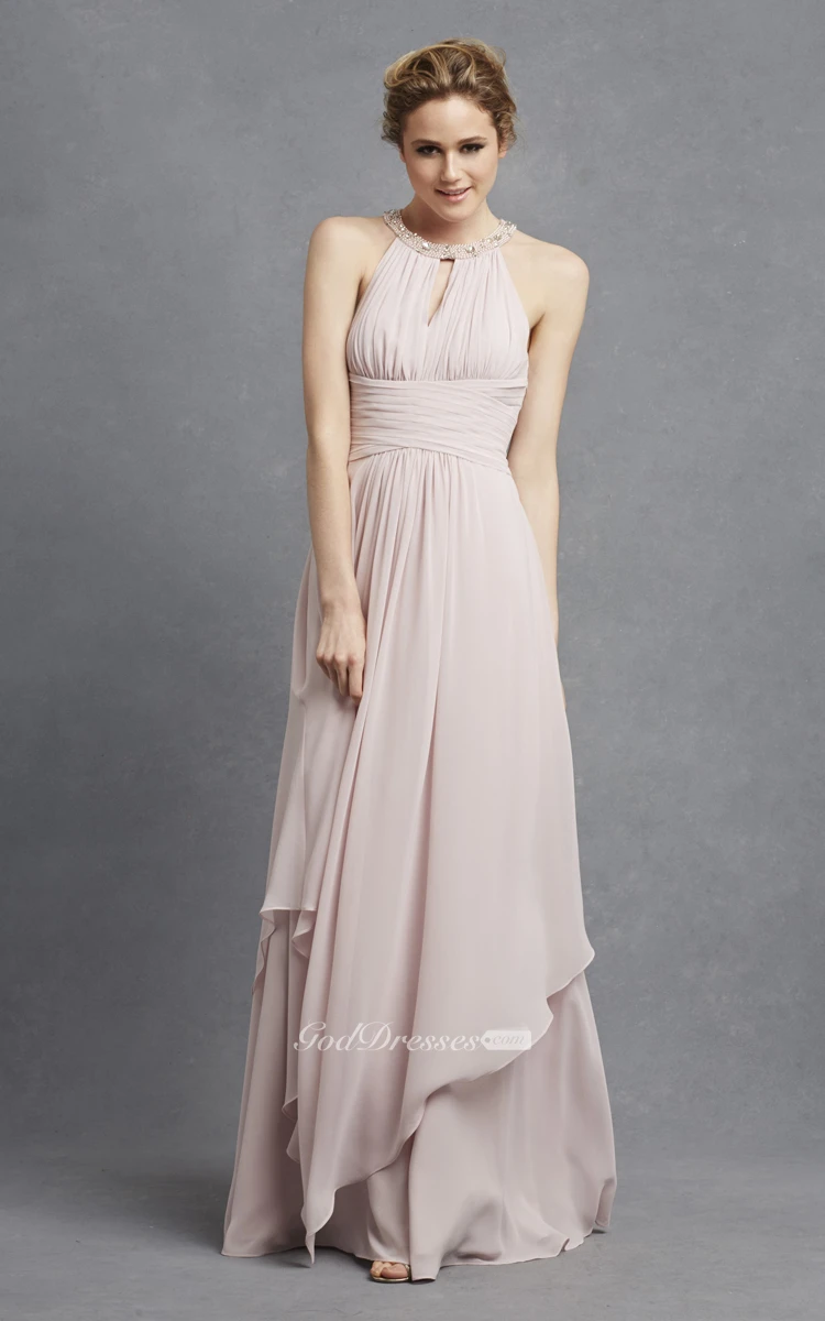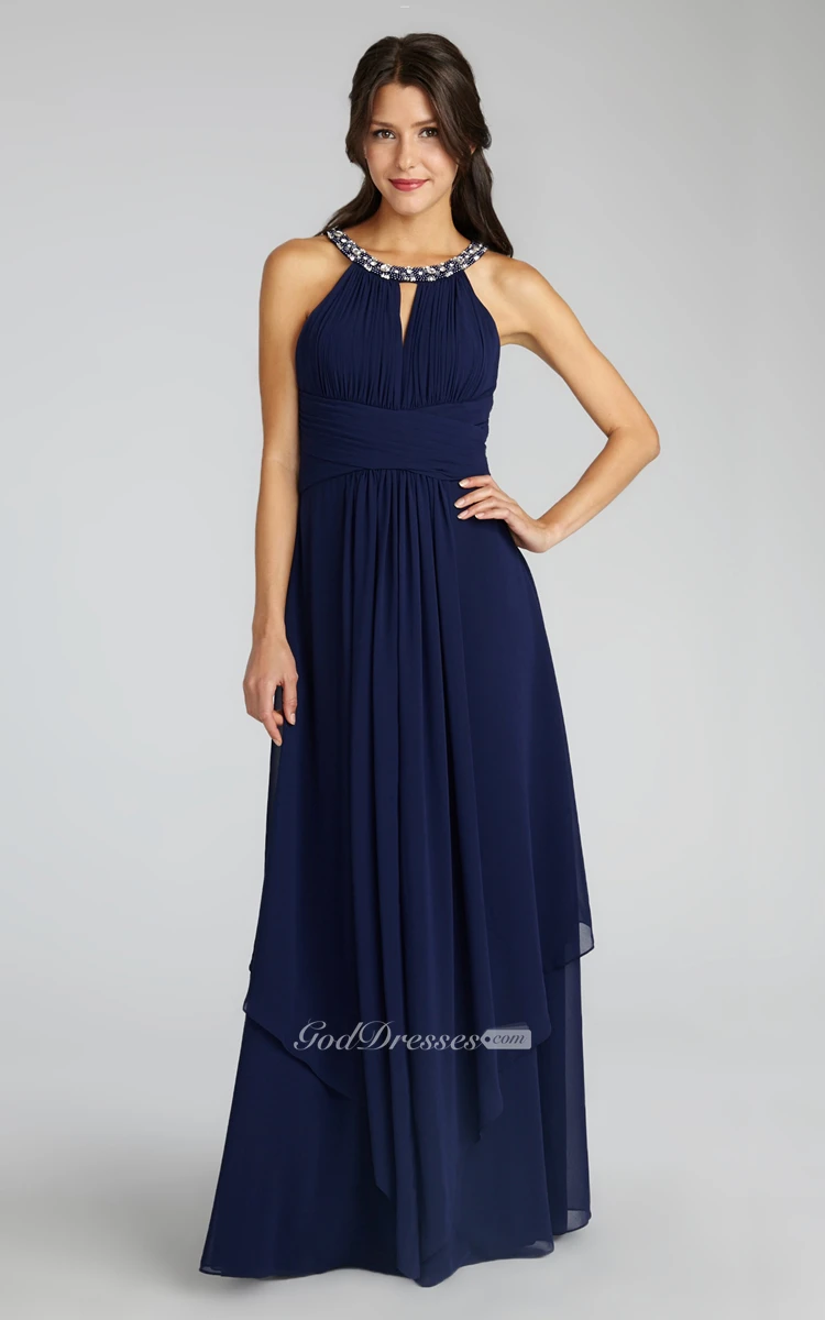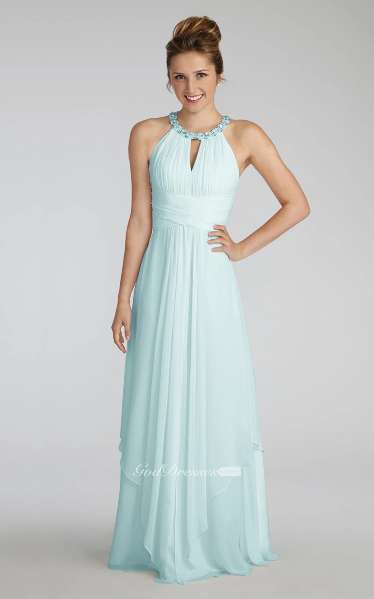 Long-Chiffon Jewel-Neck Unique Dress With Keyhole