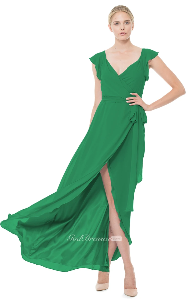 Long-Chiffon V-Neck Cap-Sleeved Dress With Split Front