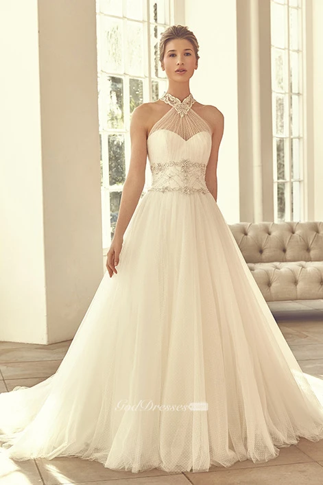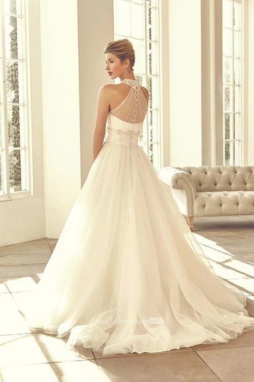 Long High Neck Beaded Tulle Wedding Dress With Court Train And Straps