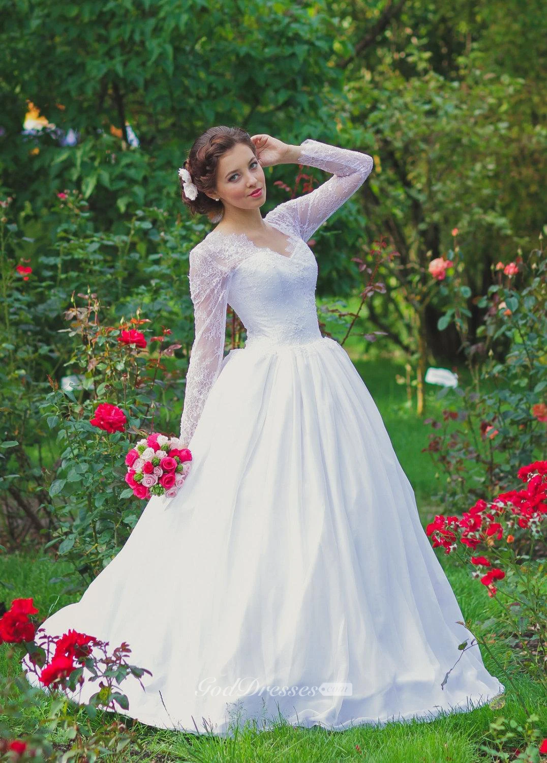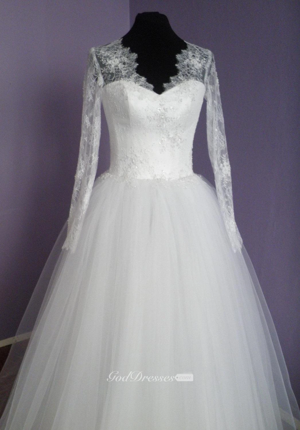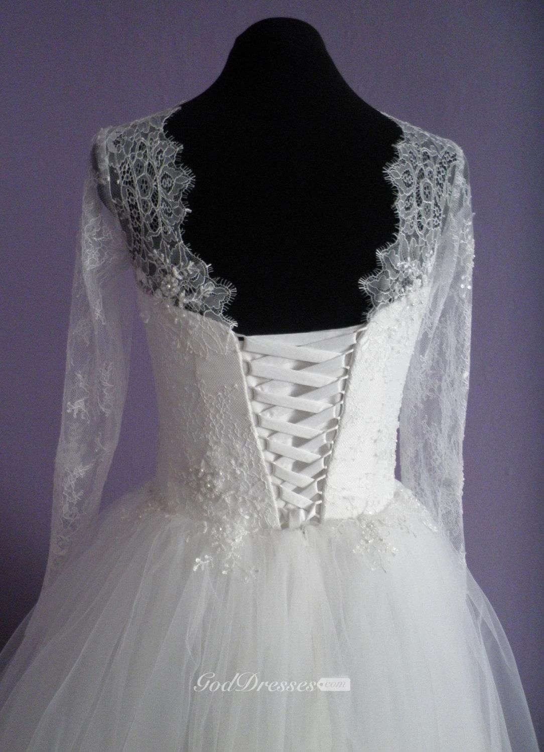 Long Illusion Sleeve Queen Anne Neckline A-Line Tulle Gown