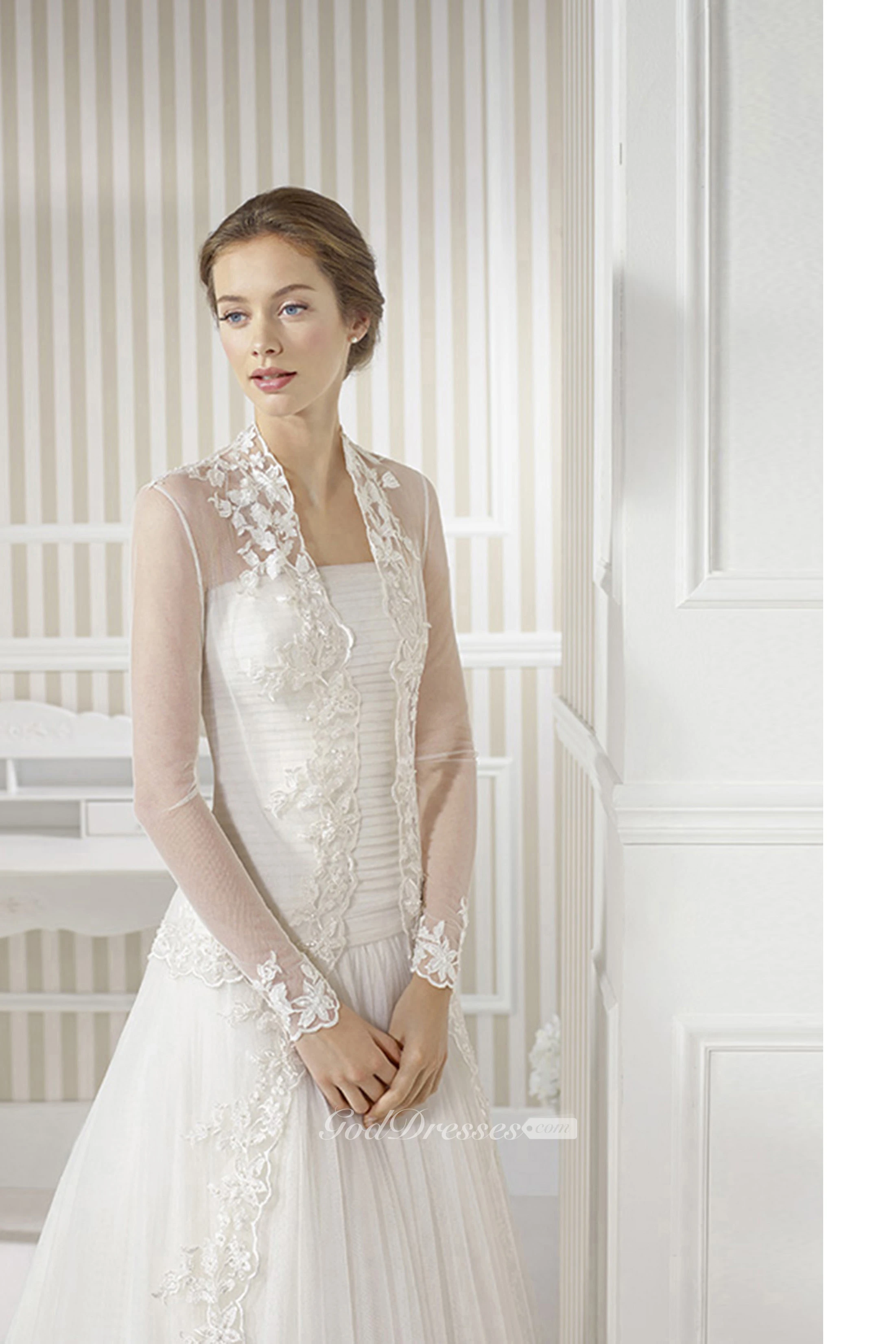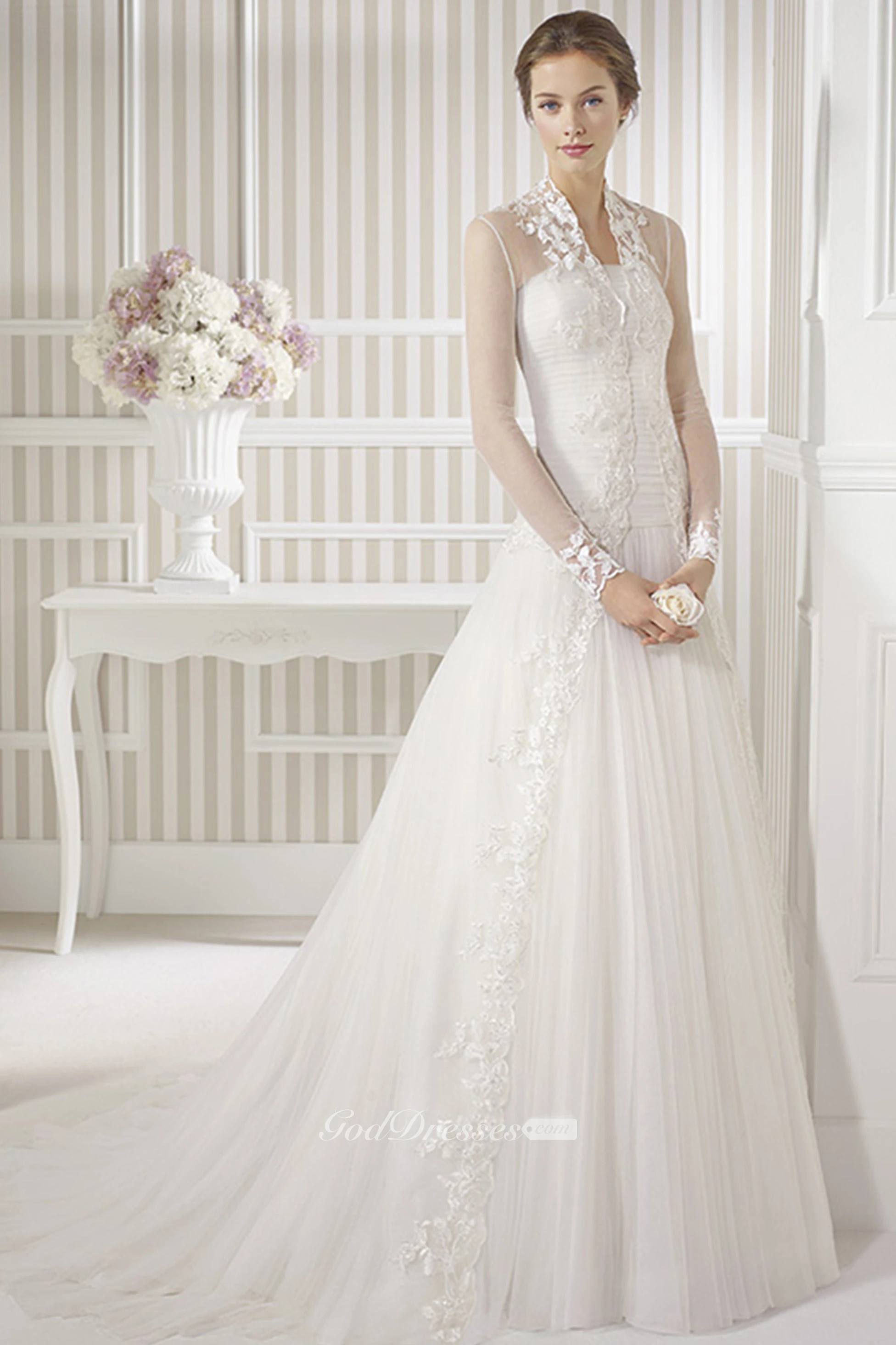 Long Long-Sleeve Appliqued Tulle Wedding Dress With Sweep Train And Illusion