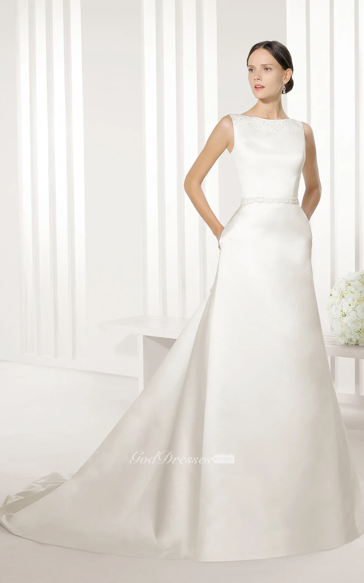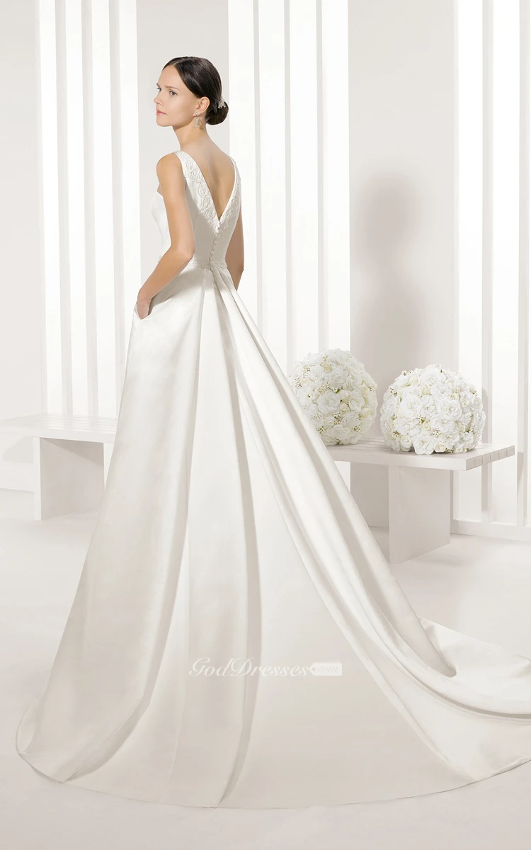 Long Noble Satin Dress With V Back And Lace Appliques